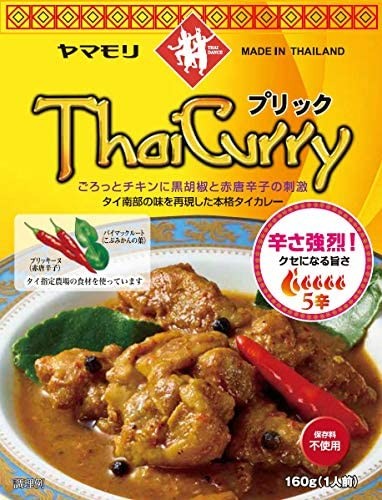 原材料:鶏肉、野菜(玉ねぎ、シャロット、にんにく)、ガランガル、ナンプラー、唐辛子、チキンパウダー、ブラックペッパー、レモングラス、シュリンプペーストパウダー(えびを含む)、食塩、ターメリック、砂糖、マナオ果汁、こぶみかんの葉/調味料(アミノ酸)、増粘剤(加工でん粉)、pH調整剤、パプリカ色素|カロリー:1箱(160g)あたり211kcal|商品サイズ(高さx奥行x幅):17.0cm×12.5cm×13.0cmタイカレープリックは、タイ南部地方の激辛なタイカレー。ヤマモリのタイカレーシリーズで一番辛いメニューです。タイ語で「プリック」は唐辛子、「プリックタイ」は胡椒を意味し、赤唐辛子と粒状のブラックペッパーが丸ごと入っています。ただ辛いだけでなく、チキンの旨みがしっかりと効いているので、一食を食べ終わった達成感とともに、不思議とまた食べたくなってしまう「やみつき感」を味わえます。ごろっと大きな鶏肉が自慢の、シリーズの中でも一番鶏肉量が多く、大満足のボリュームです。日本と同じ水準の品質管理を適用したタイの現地自社工場で、本格的な味わいに仕上げました。レトルトパウチ食品ですので、ご家庭で手軽に本場タイの味をお楽しみいただけます。1箱で160g(1人前)。保存料無添加。