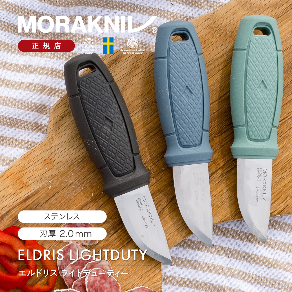 カッター感覚で使えるユースフルなナイフブレードの長さ59mm、厚さ2mmと、モーラナイフのアウトドア向けナイフの中でも非常に小さくコンパクトな「エルドリス」シリーズは、おもちゃのようなサイズ感ながらもとても使い勝手の良いEDC(Every Day Carry)ナイフです。首にかけられるネックナイフ仕様になっていて、使いたい時にすぐ取り出せる携帯性が魅力です。既存のエルドリスのブレードをさらにシンプルな形状にした「エルドリス ライトデューティー」は、機能はそこまで多くなくとも、とても実用的なナイフ。お庭での作業からキッチン周り、DIYなど、まるでカッターのように、より生活に密着した作業を得意とするナイフです。もちろんアウトドアでも使用できるので、何かと活躍の幅の広い一本と言えます。