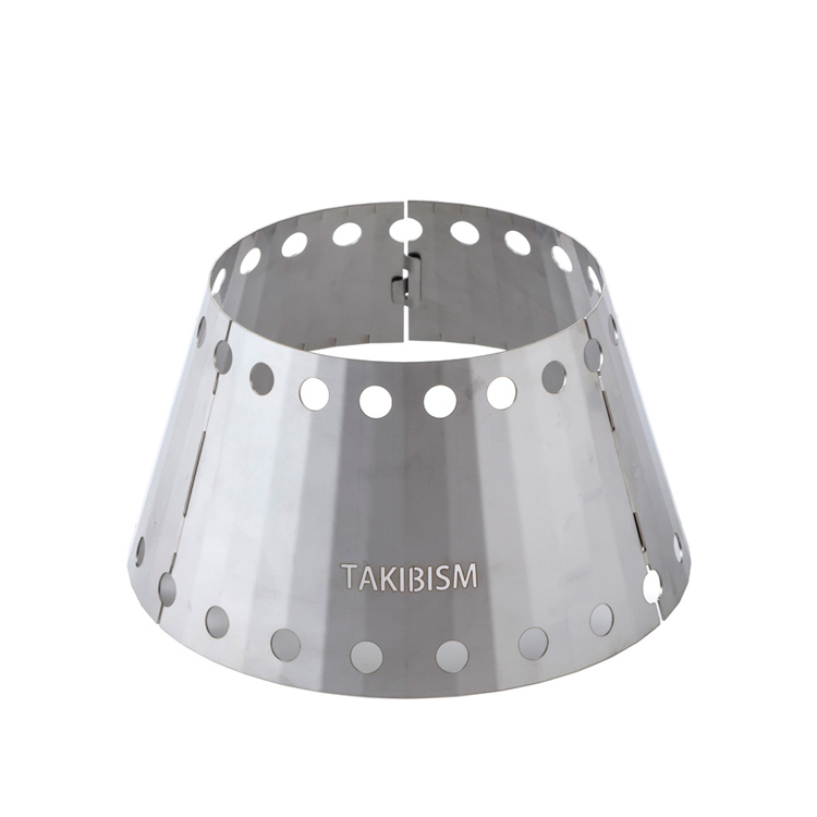 煙突効果で炎が集中し、炒飯に必要な火力を作り出すステンレス製。強度を増すため厚みと曲げ加工、「TAKIBISM」のロゴカッティングがあしらわれた逸品です。ツメで繋げる3分割式のため、分解すればかなりコンパクトに、中華鍋の内側に収まります。
