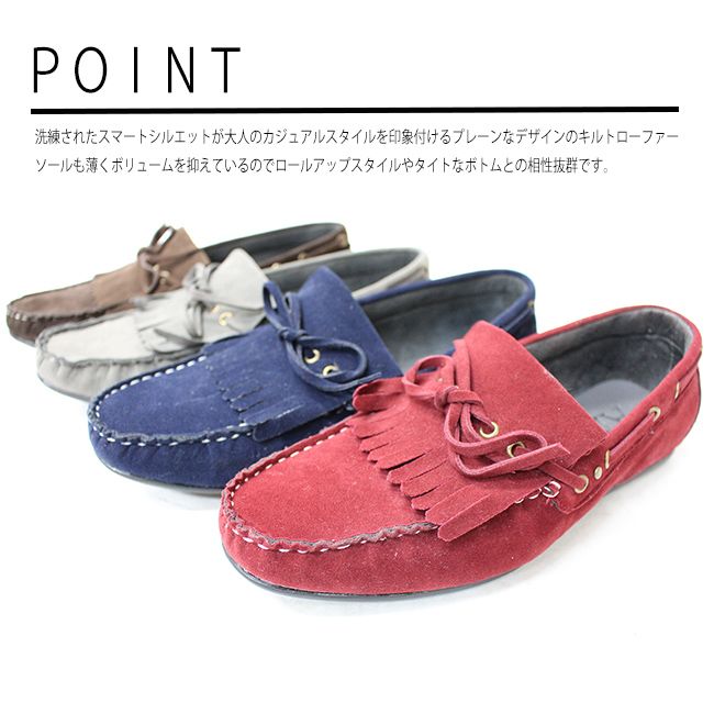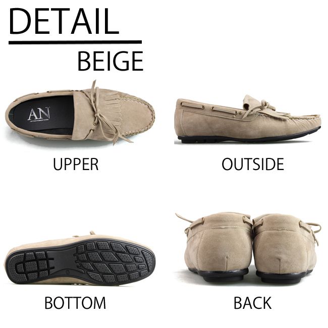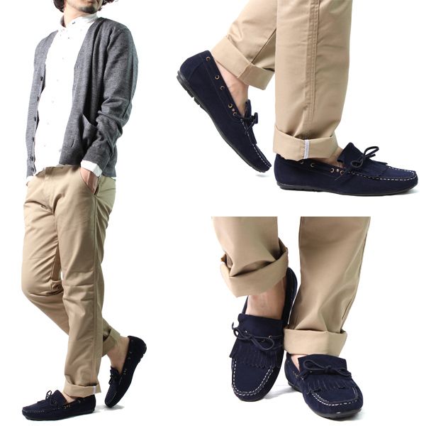 ホワイトステッチが目を引くモカシン縫いを施した丸みのあるトゥにナチュラルな質感に暖かみを感じるフェイクスウェードを素材に使用、クセが無いデザインが幅広いコーディネイトに対応してくれます。