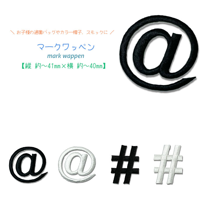 | ワッペン サイズ 縦×横 | 【1】アットマーク(黒) | 約39mm×40mm | 【2】アットマーク(白) | 約39mm×40mm | 【3】シャープ(黒) | 約41mm×29mm | 【4】シャープ(白) | 約41mm×29mm |