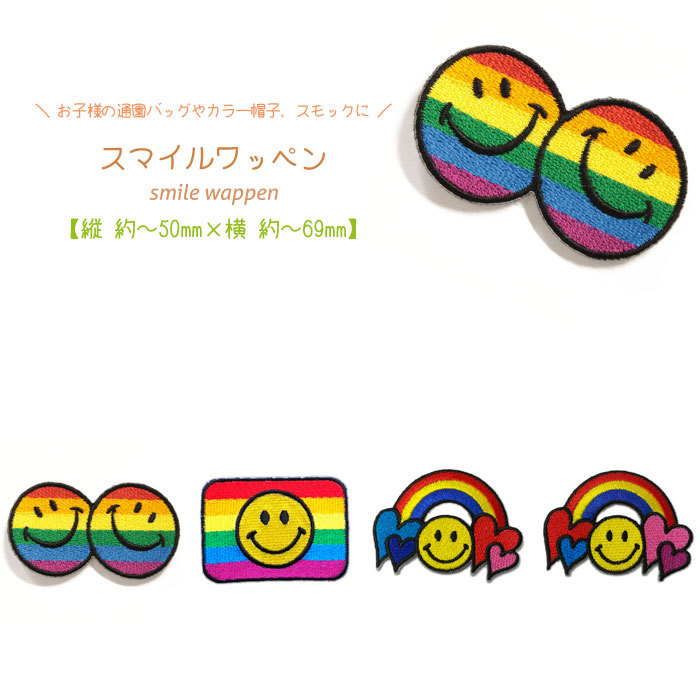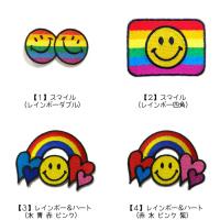 | ワッペン サイズ 縦×横 | | 【1】スマイル(レインボーダブル) | 約32mm×55mm | | 【2】スマイル(レインボー四角) | 約50mm×69mm | | 【3】レインボー&ハート(水 青 赤 ピンク) | 約50mm×69mm | | 【4】レインボー&ハート(赤 水 ピンク 紫) | 約50mm×69mm |