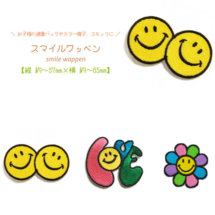 | ワッペン サイズ 縦×横 | | 【1】スマイル(ダブル) | 約32mm×55mm | | 【2】スマイル(ラブ) | 約57mm×65mm | | 【3】フラワー(手描き風) | 約51mm×50mm |