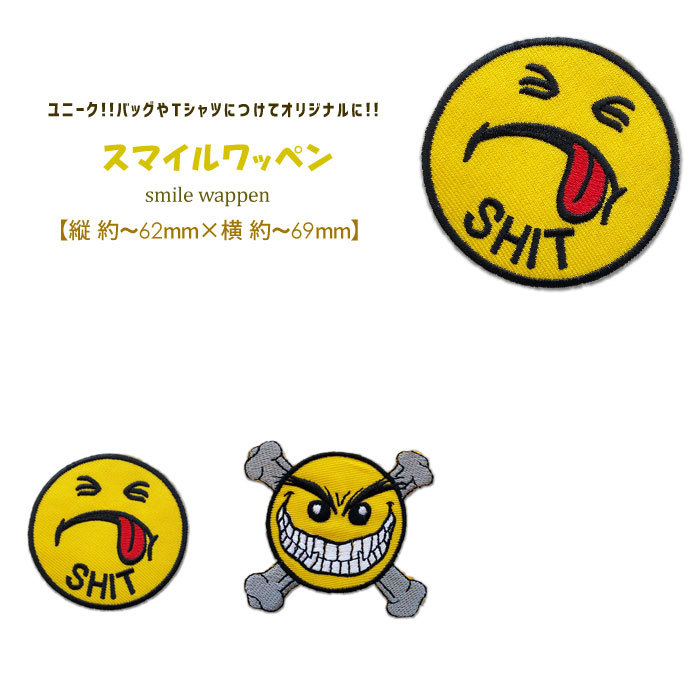 | ワッペン サイズ 縦×横 | | 【1】スマイル(SHIT) | 約60mm×60mm | | 【2】スマイル(どくろ) | 約62mm×69mm |