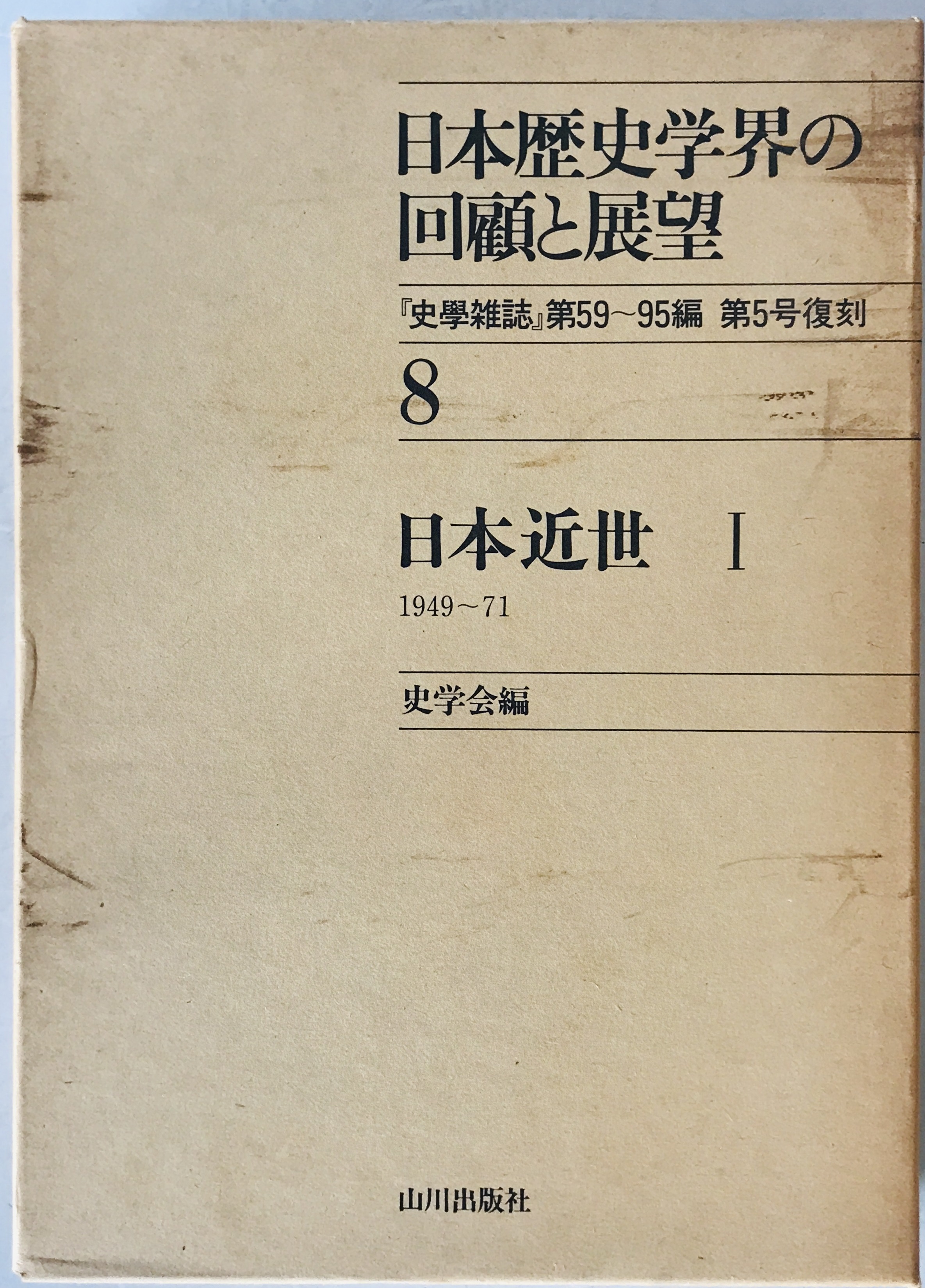 ・書名:日本歴史学界の回顧と展望 8 (日本近世 1 1949〜71) ・ISBN:4634310805 ・著者:史学会 編 ・出版元:山川出版社 ・刊行年:1987/09/30 ・解説:天、地、小口に経年によるシミ、ヨゴレあり 函にヤケ、ヨゴレあり