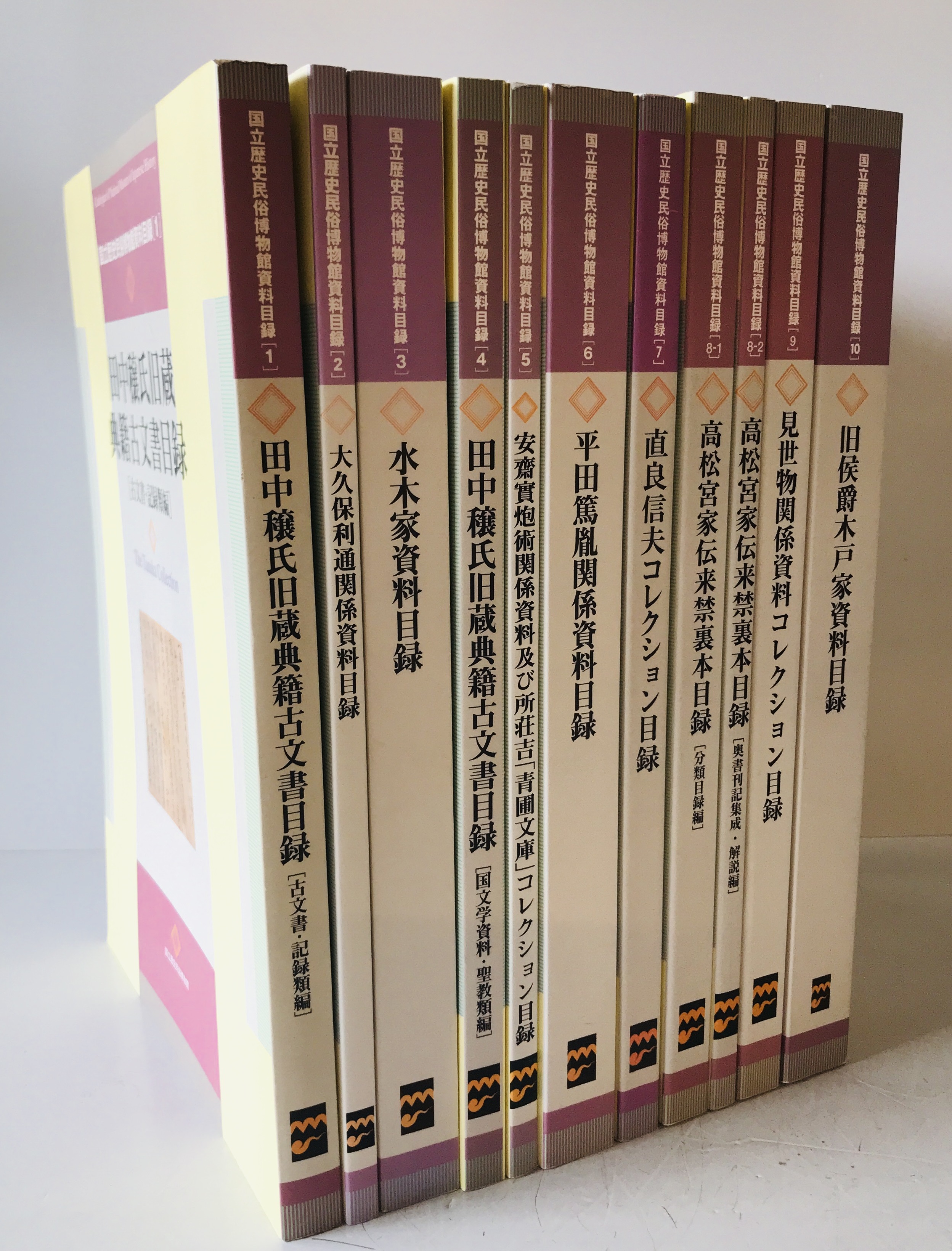 ・書名:国立歴史民俗博物館資料目録 1〜10 11冊揃 ・ISBN: ・著者:国立歴史民俗博物館編集 ・出版元:歴史民俗博物館 ・刊行年:2000/03-2011/02 ・解説:1.田中穣氏旧蔵典籍古文書・記録類編、2.大久保利通関係資料目録、3.水木家資料目録、4.田中穣氏旧蔵典籍古文書目録 国文学資料・聖教類編、5.安齋實炮術関係資料及び所荘吉「青圃文庫」コレクション目録、6.平田篤胤関係資料目録、7.直良信夫コレクション目録、8-1.高松宮家伝来禁裏本目録 分類目録編、8-2.高松宮家伝来禁裏本目録