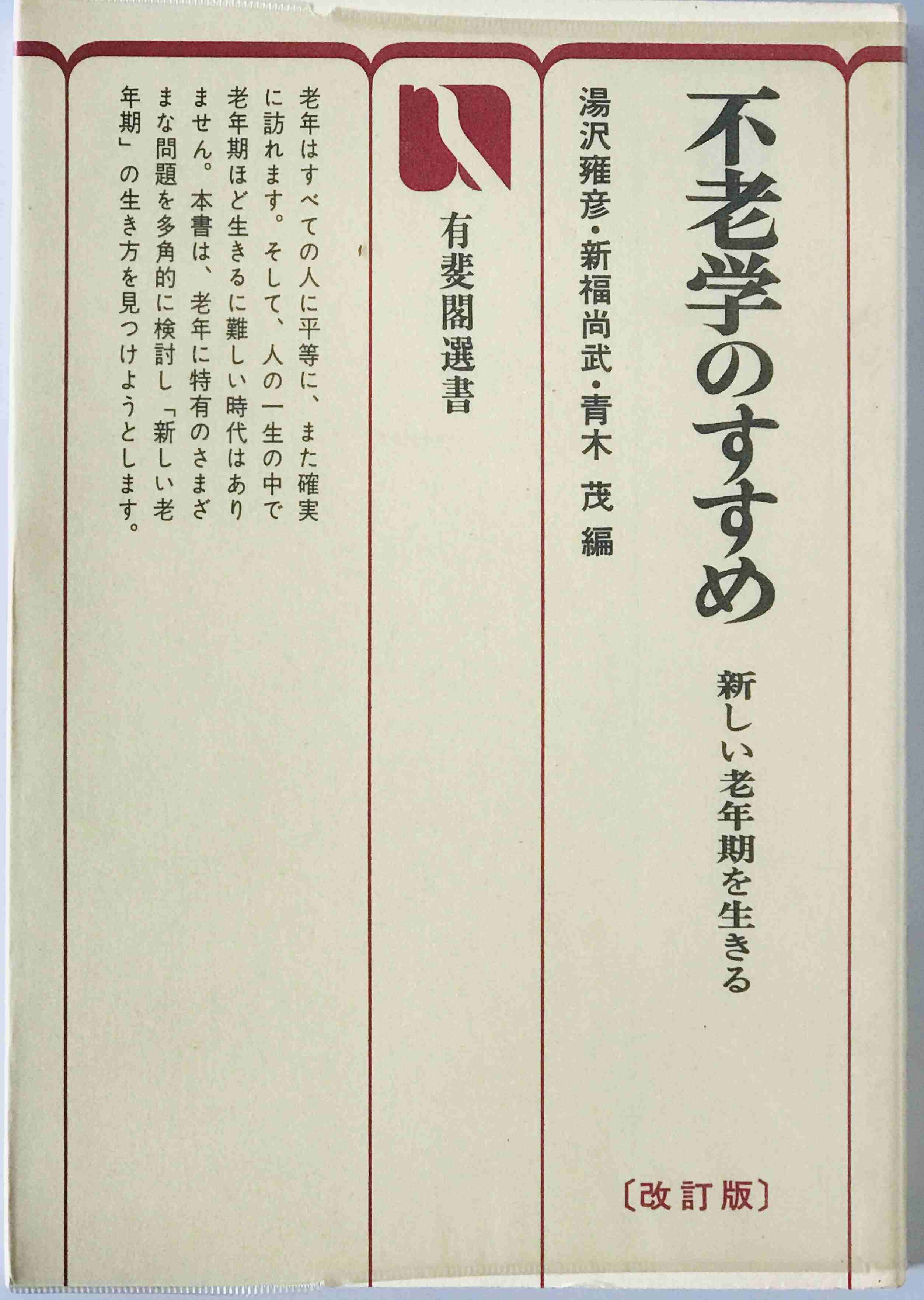 ・書名:不老学のすすめ : 新しい老年期を生きる 改訂版 新しい老年期を生きる ・ISBN: ・著者:湯沢雍彦, 新福尚武, 青木茂 編 ・出版元:有斐閣 ・刊行年:1976/11/10 初版第1刷 ・解説:見返しに蔵書印あり
