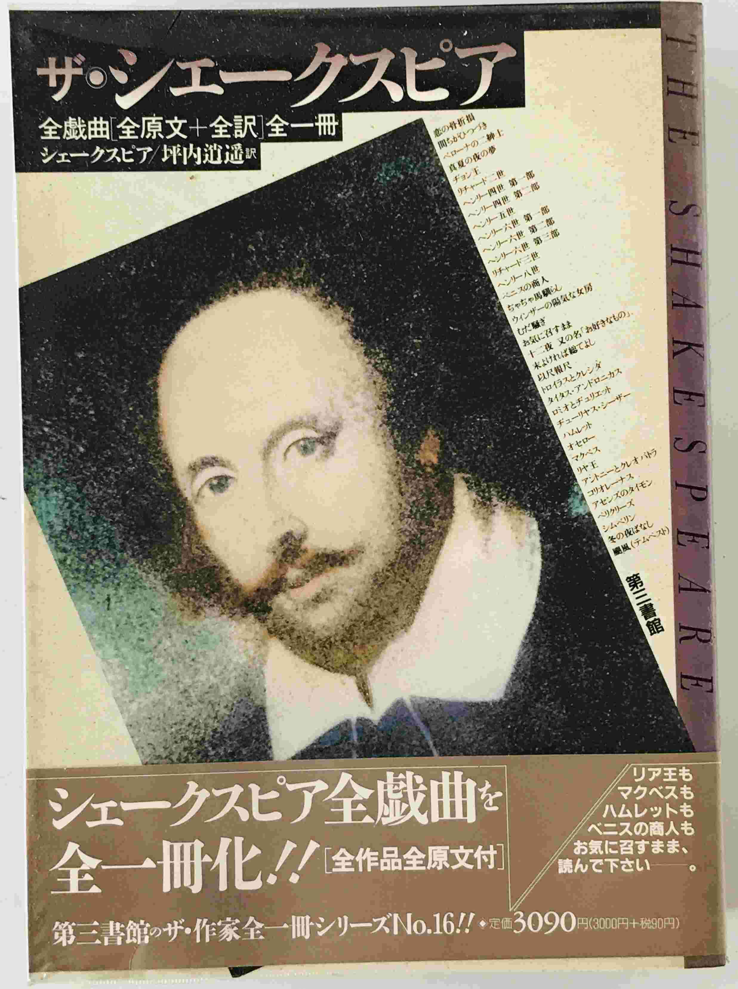 ・書名:ザ・シェークスピア : 全戯曲(全原文+全訳)全一冊 ・ISBN: ・著者:シェークスピア 著 ; 坪内逍遥 訳 ・出版元:第三書館 ・刊行年:1990/09/01 第2刷 ・解説:本体にヤケ少あり