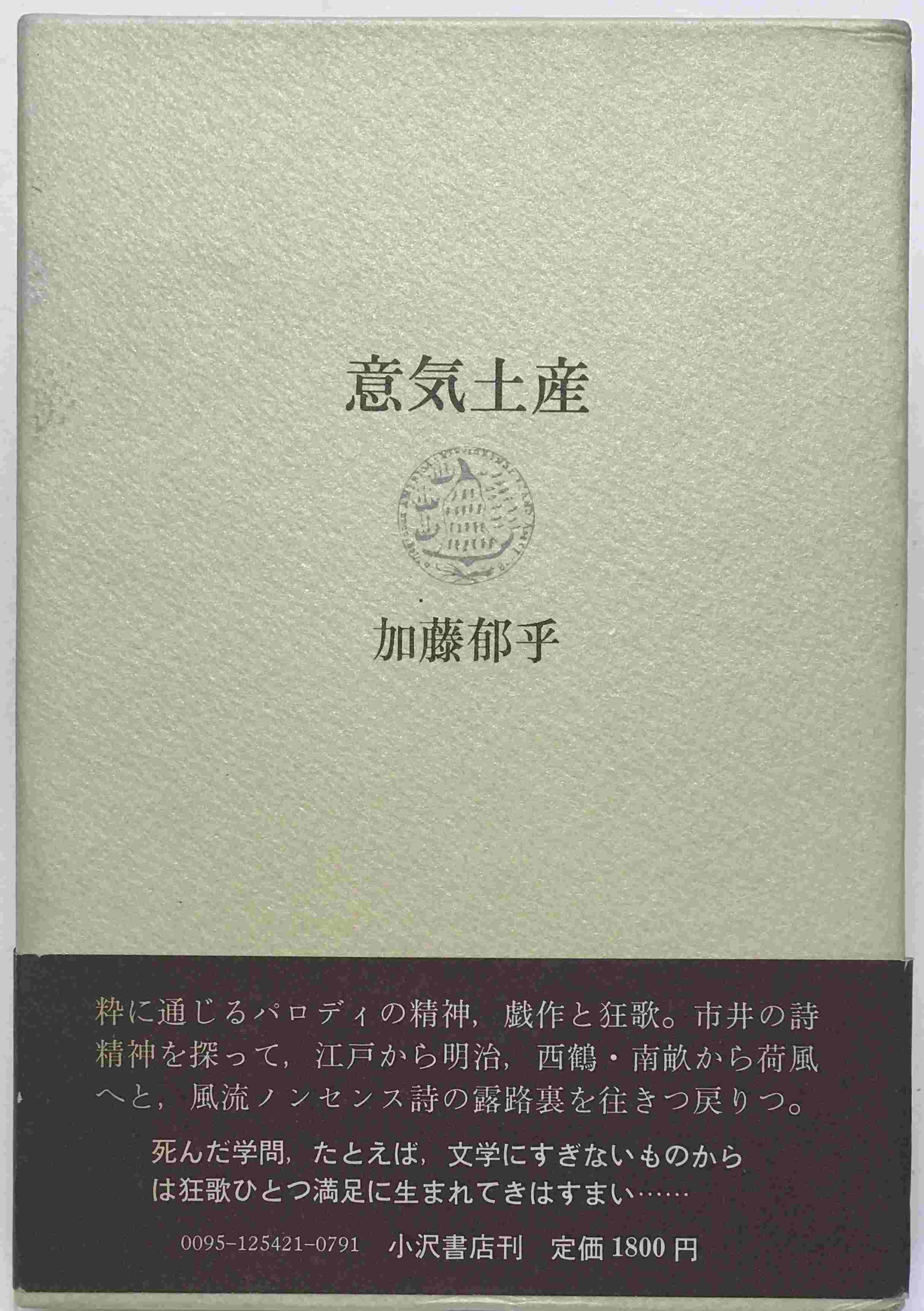 ・書名:意気土産 ・ISBN: ・著者:加藤郁乎 著 ・出版元:小沢書店 ・刊行年:1979/10/20 ・解説:カバー汚れイタミあり、 帯スレあり、本内貼り付けあり