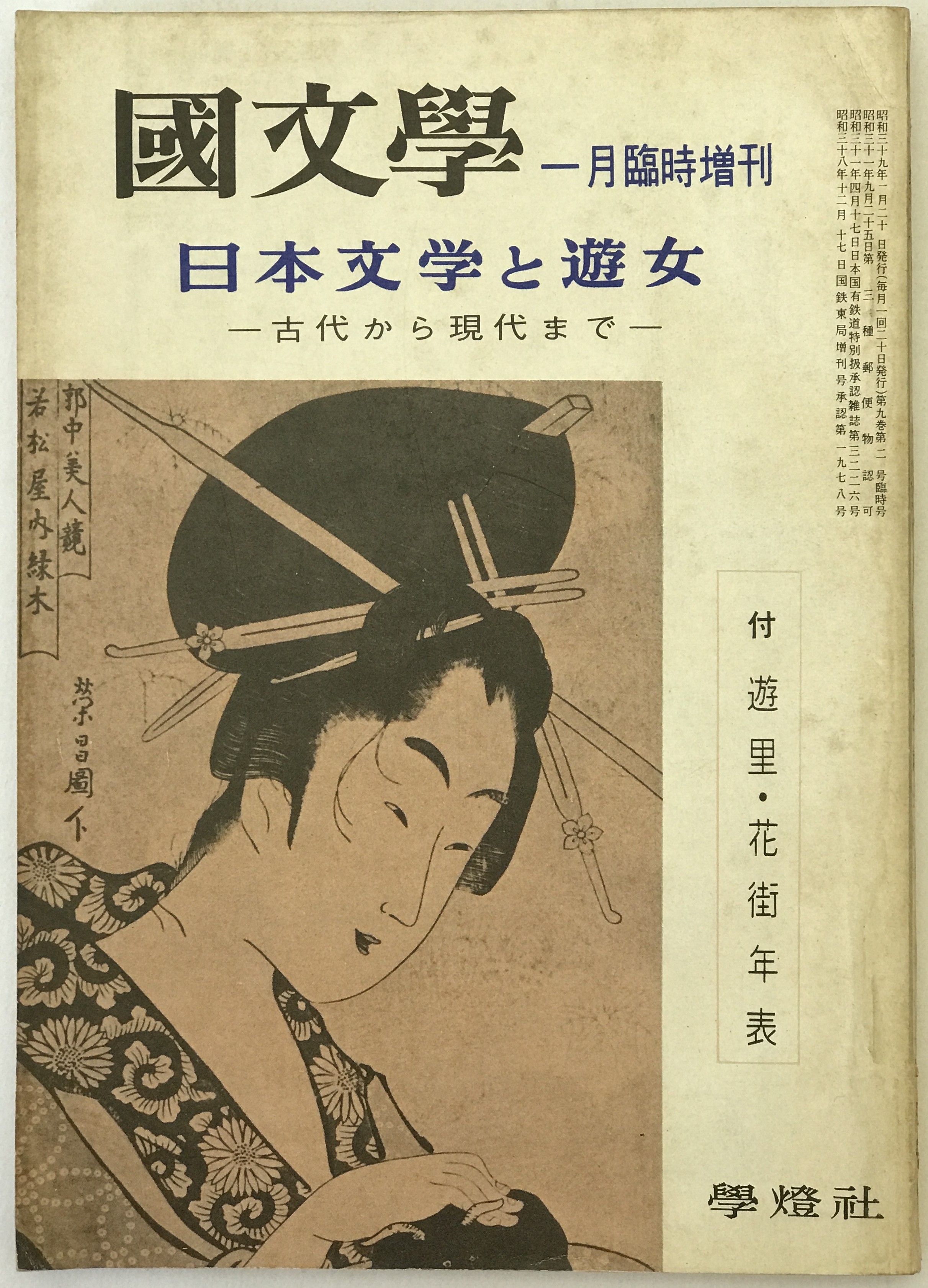 説明:「國文學 : 解釈と教材の研究 一月臨時増刊 日本文学と遊女 古代から現代まで」は、學燈社編による1964年刊行の資料集です。本号は日本文学における遊女の描かれ方を古代から現代までの視点で整理し、多角的に分析しているようです。文学作品の解釈や教材としての活用を意識した編集がされており、歴史的背景や文化的側面にも触れている可能性が考えられます。国内の學燈社から発行された専門的な研究誌の臨時増刊号として、文学や歴史に関心のある方にとって参考となる内容が含まれているかもしれません。