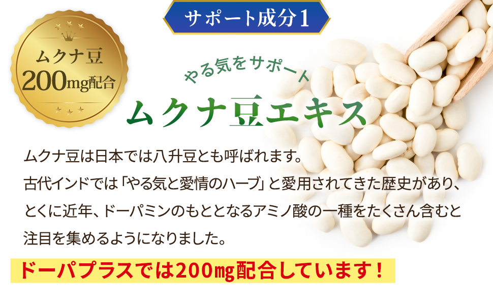 漢方の老舗 占部大観堂製薬(株)が、開発、製造した ドーパプラス は、ムクナ豆エキス を1日1粒にたっぷり200mg配合