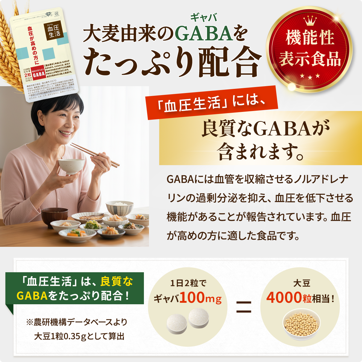 【届出表示】D570 GABAには血圧が高めの方の血圧を低下させる機能があることが報告されています。血圧が高めな方に適した食品です。