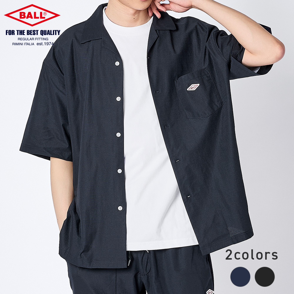 オープンカラーシャツ 半袖 メンズ メッシュ ストレッチ 速乾 シャツ 涼しい 通気性 軽い 薄い 透け感 ロゴ 胸ポケット カジュアル シンプル 夏 春 BALL 55702