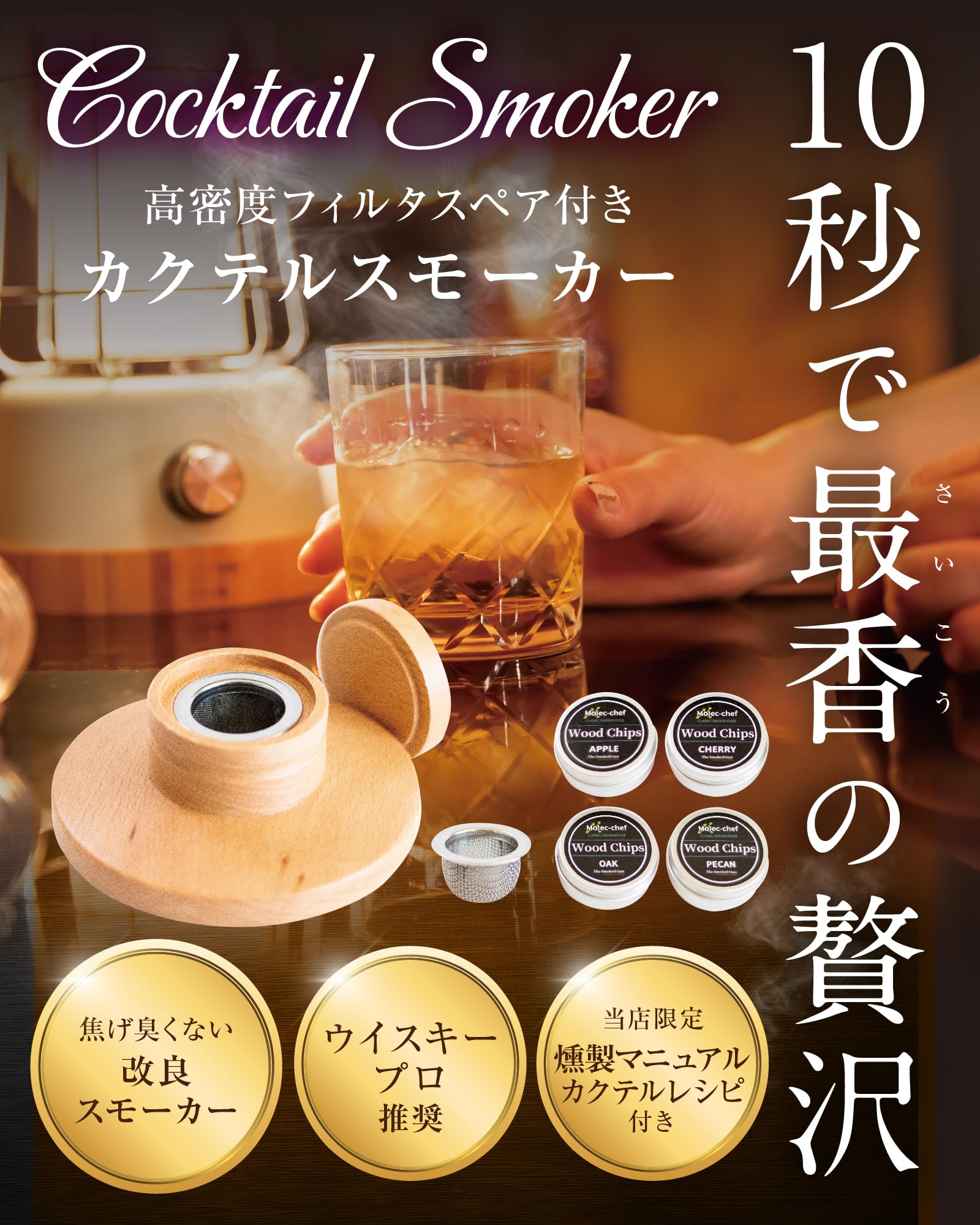 | ?【4種のスモークチップ&高濃度フィルタースペア付き】アップル、チェリー、オーク、ピーカン、4種類の化学薬品不使用天然ウッドチップで、スモーキー&フルーティな香りと味を。1缶で60回、合計240回楽しめます。高濃度フィルタースペア付きで長く楽しめます。 |