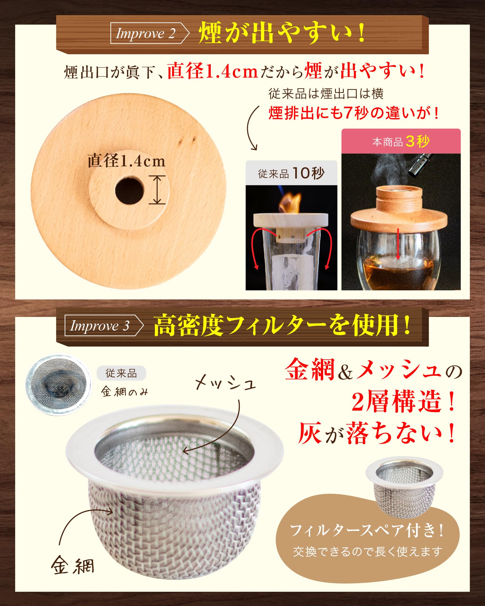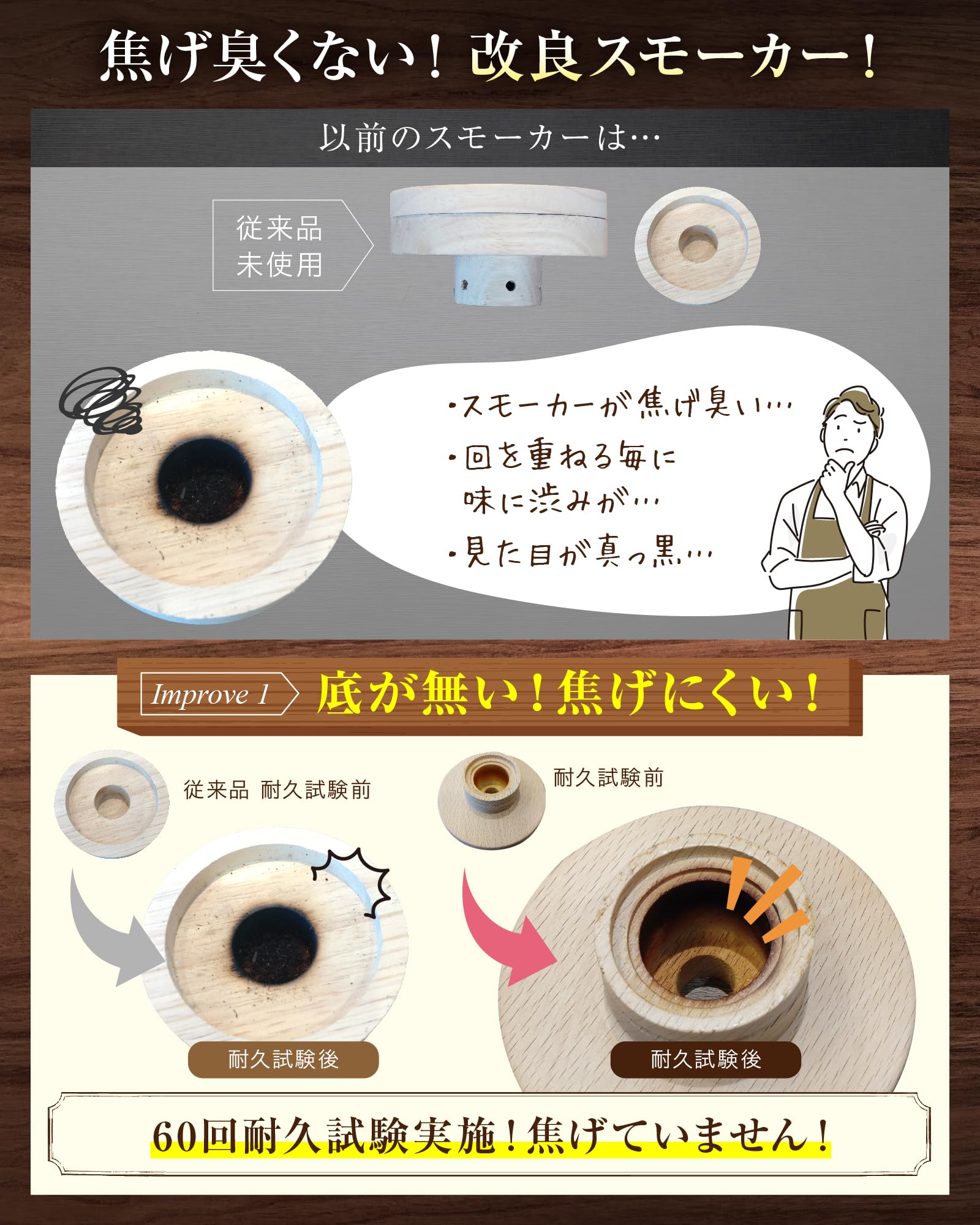 | ?【焦げない改良設計】従来品は燻製を重ねる毎に焦げが発生し、臭い、味に渋みが出る、見た目が真っ黒など問題が発生しておりました。今回改良設計を行い、底が無く焦げにくい、煙が出やすい構造に改良致しました。 |