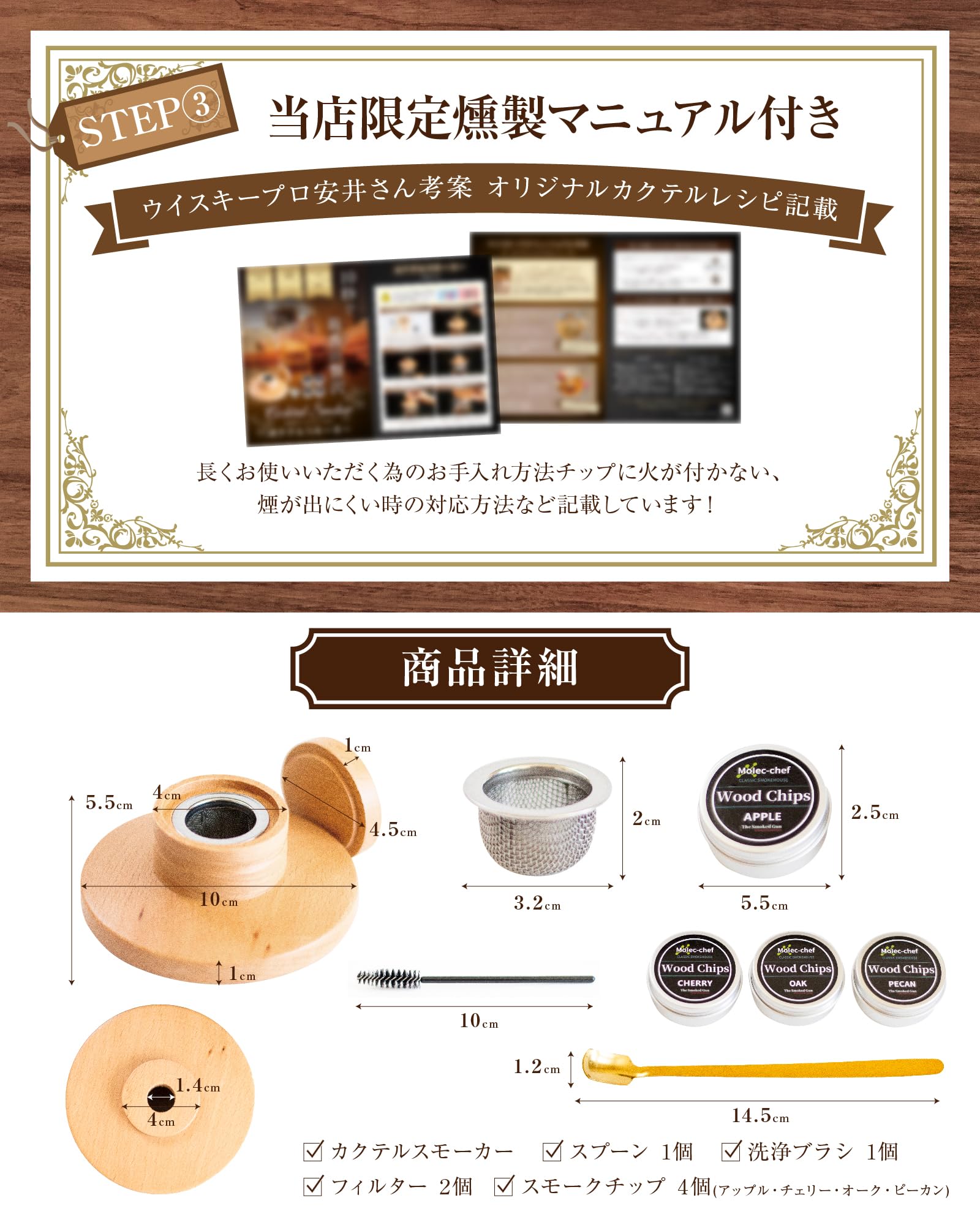 | ?【初心者も安心】燻製マニュアル&ウイスキープロ考案カクテルレシピ付き。このスモーカーで煙が出ないとは言わせません!※ターボライター、ターボ型のチャッカマン、マイクロトーチが別途必要です。 |