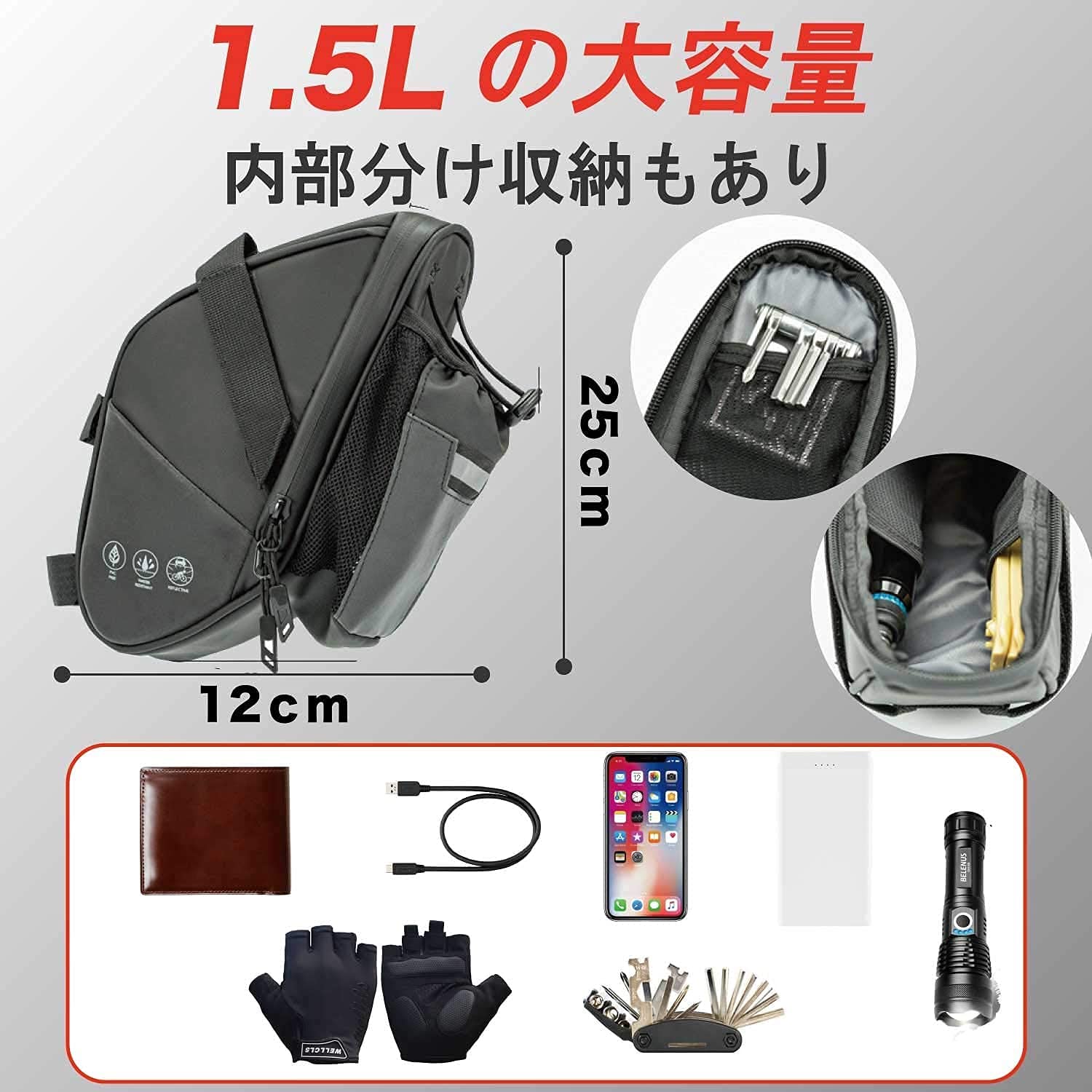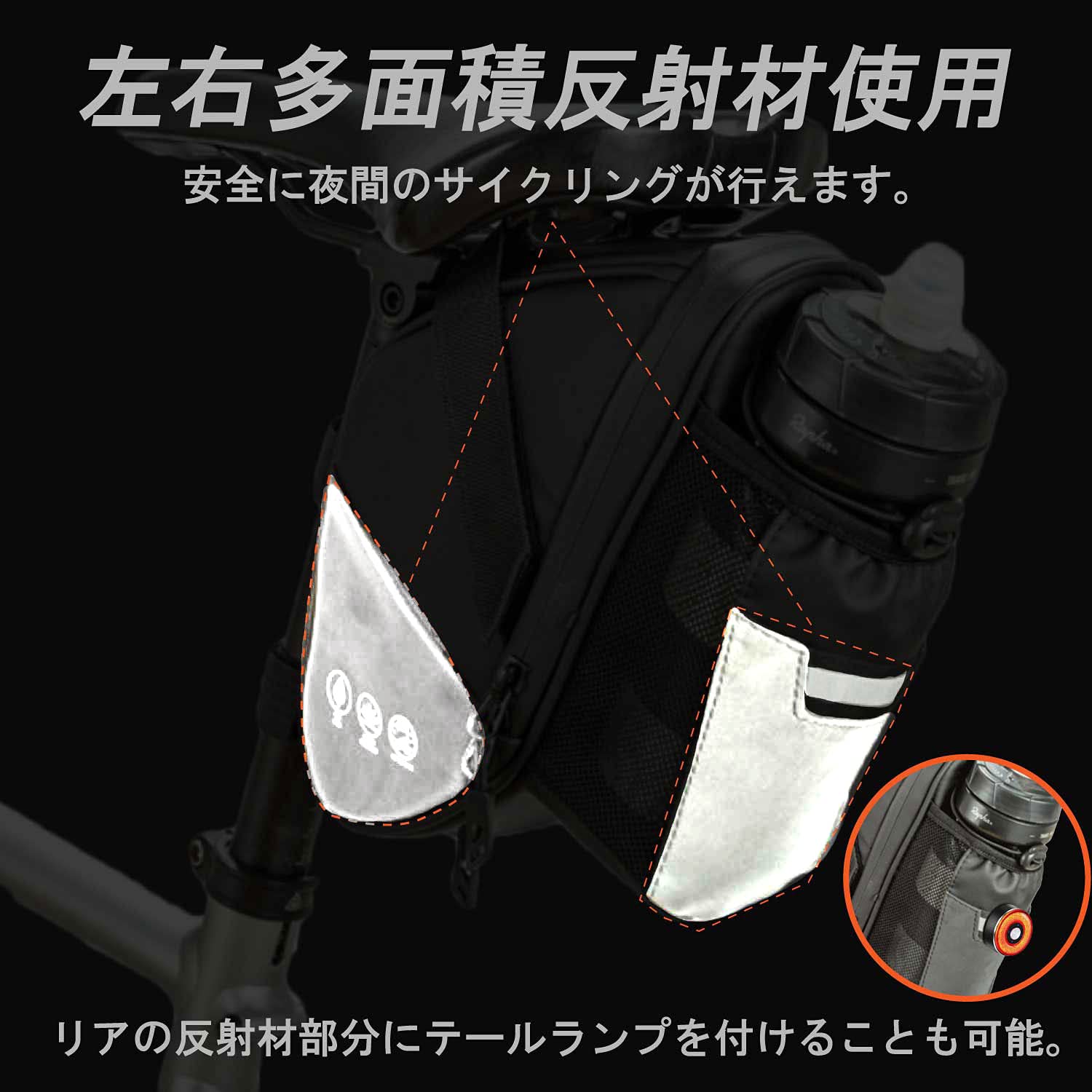 | ?【反射材】バッグ後方の両サイドと水筒収納部分は広い面積に反射材が加工されており、夜間走行でも安全に走行可能です。並行車や対向車に、いち早くあなたの存在を広く知らせることができます。※画像の丸く赤い反射板は付属しておりません。 |