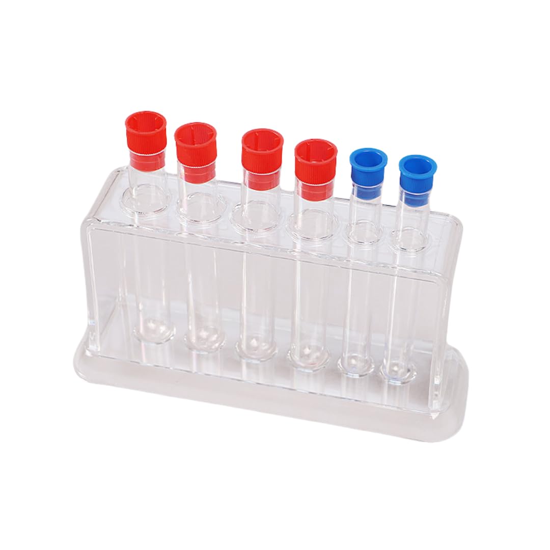 【商品詳細】サイズ:?17cm×13cm×5cm、重量:80g、材質:プラスチック、梱包内容:試験管立て・試験管6本(フタつき) |
