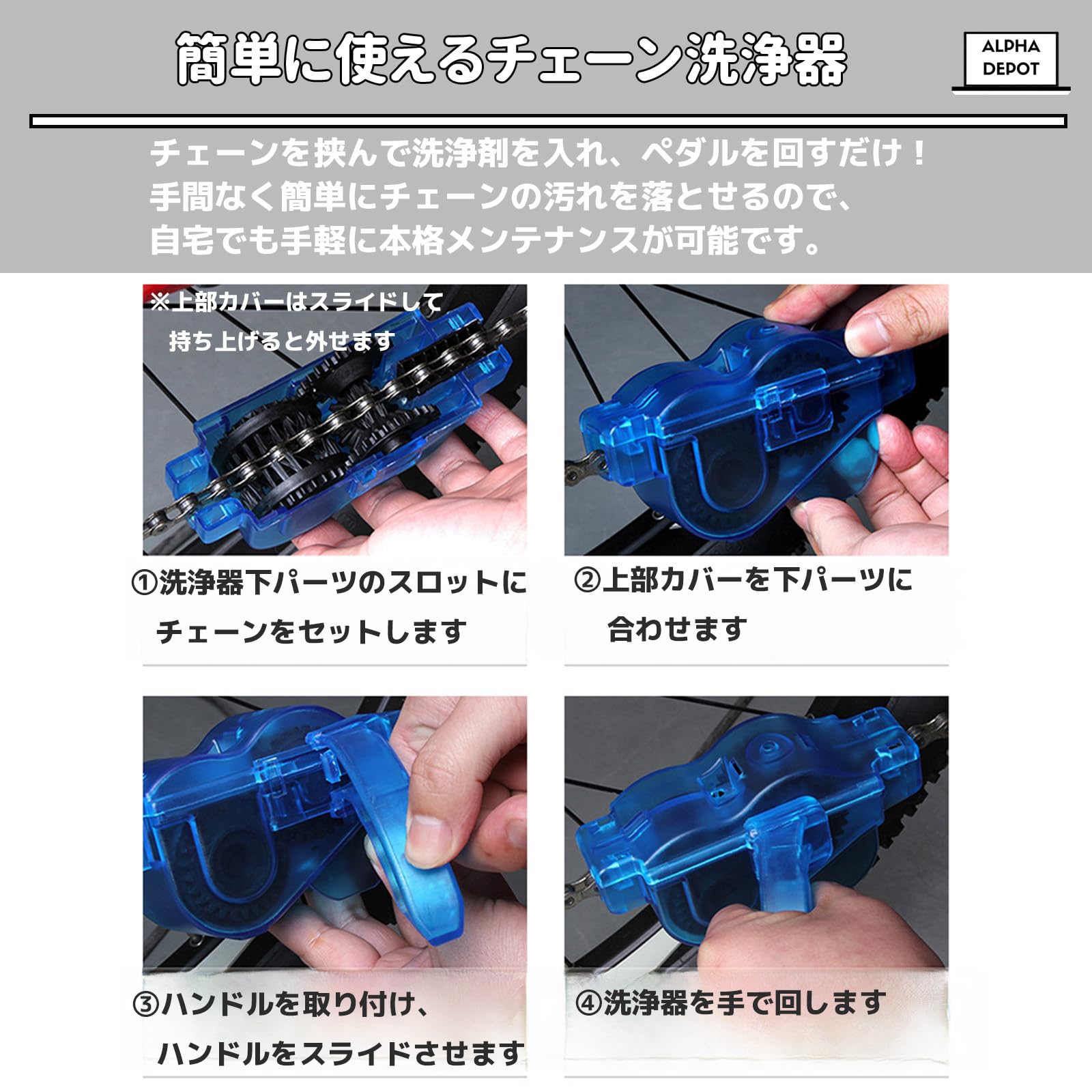 | 【簡単に使えるチェーン洗浄器】チェーンを挟んで洗浄剤を入れ、ペダルを回すだけ!手間なく簡単にチェーンの汚れを落とせるので、自宅でも手軽に本格メンテナンスが可能です。 |