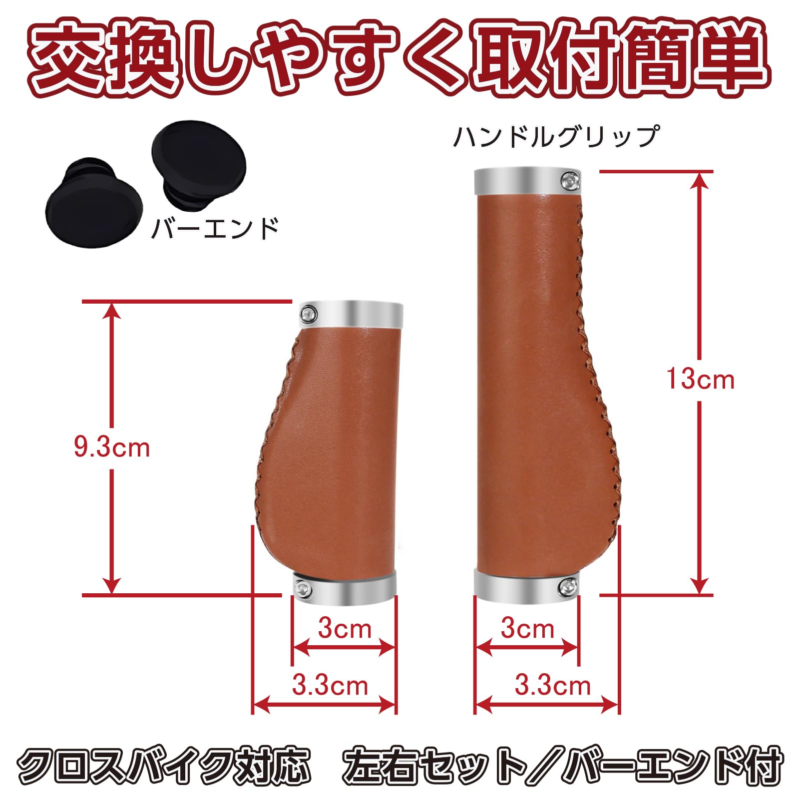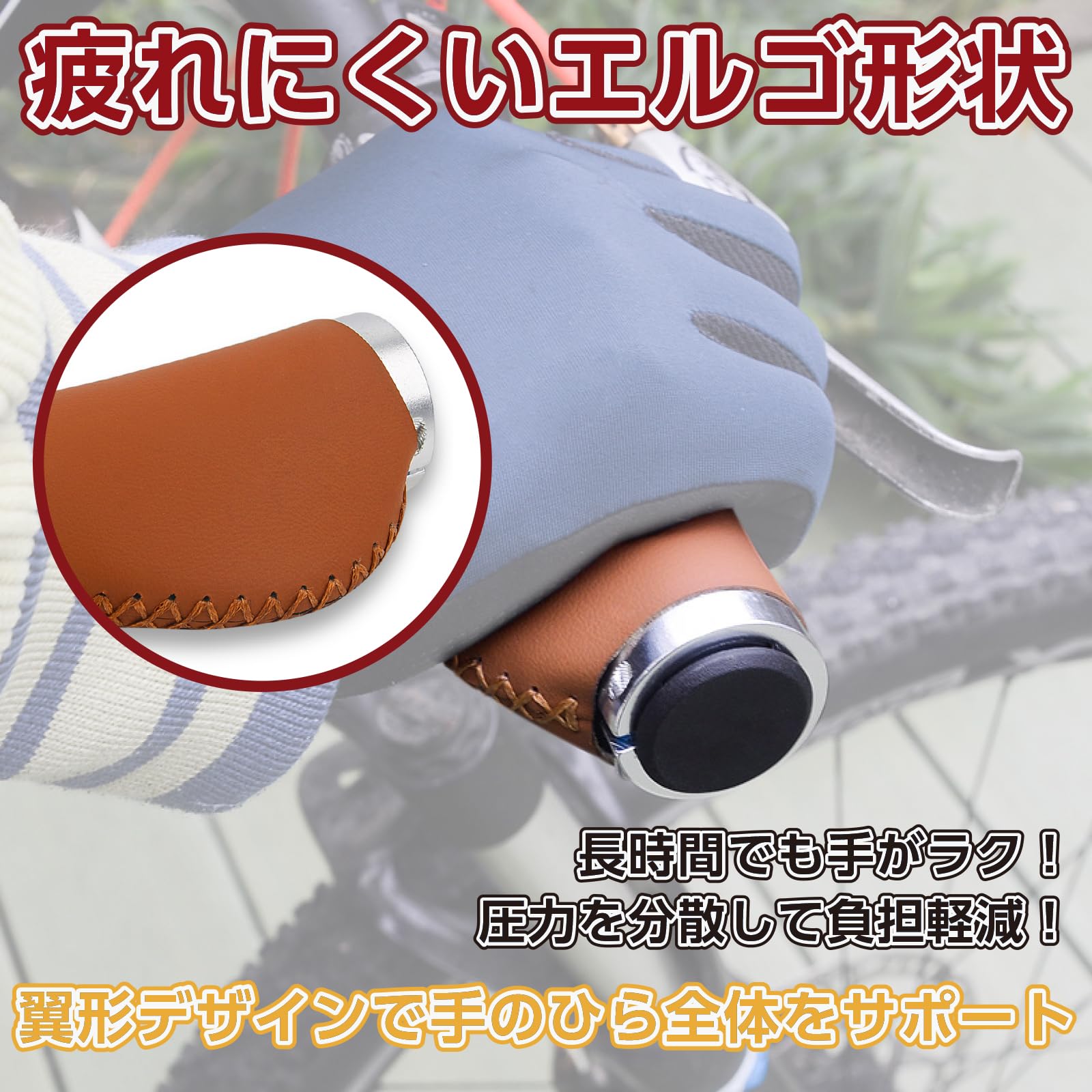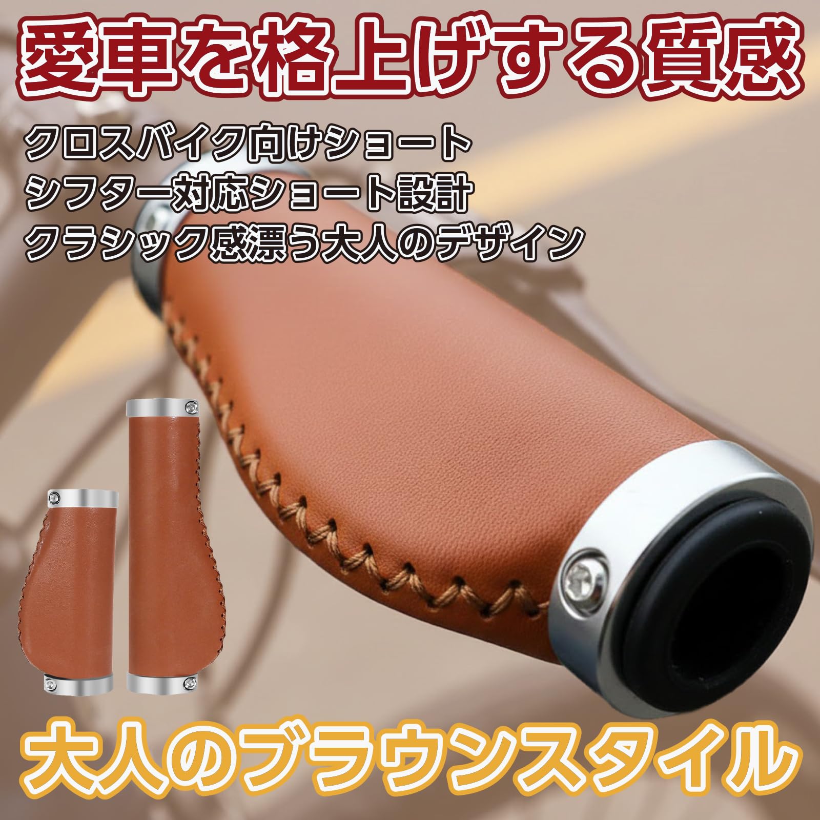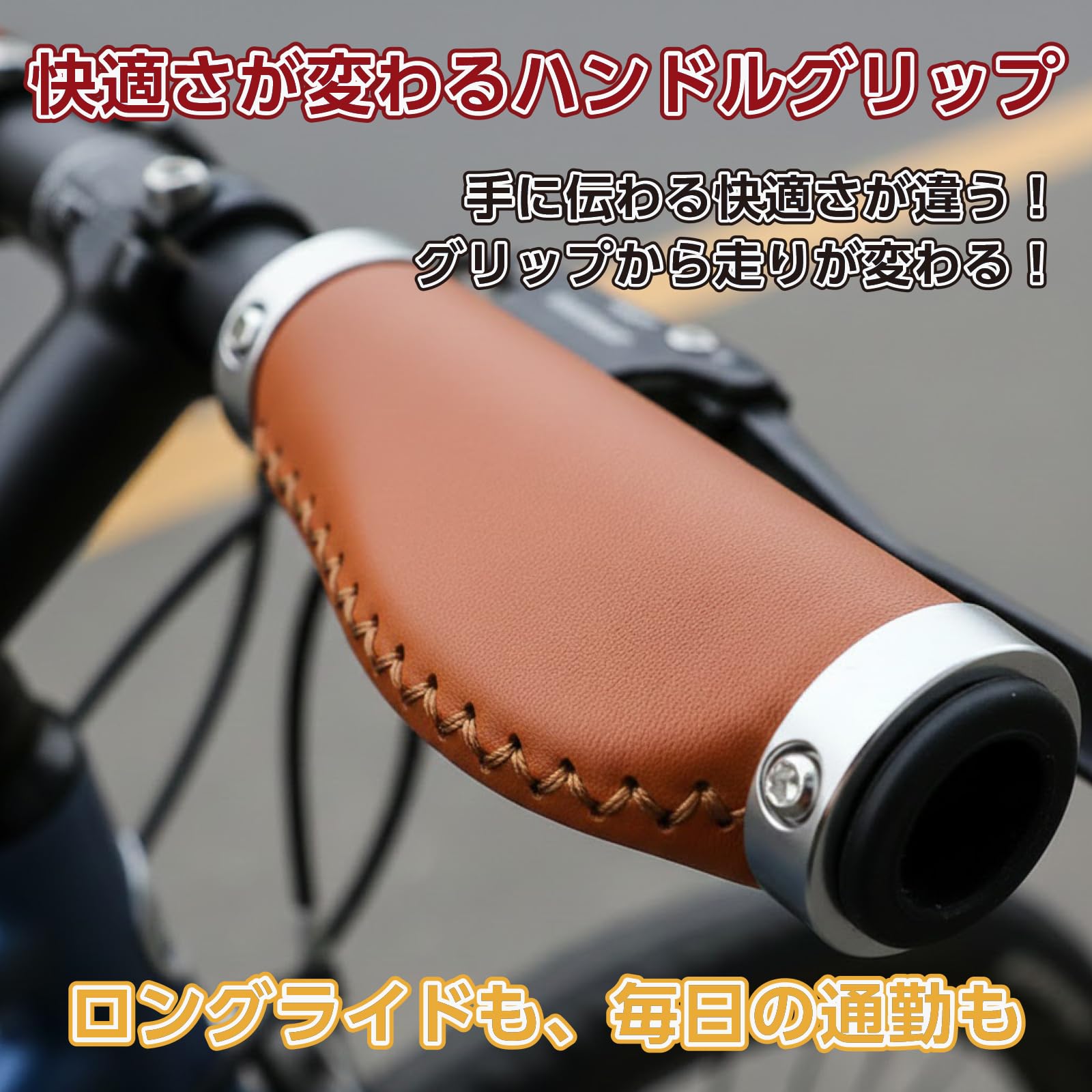| 機能性だけでなく、愛車のルックスにも貢献します。本革のような風合いを持つPUレザーを採用し、クラシックなブラウンカラー、バーエンド付。雨や手汗を気にせず使える高耐久素材が、愛車を格上げする上質なグリップ感を提供します。 |