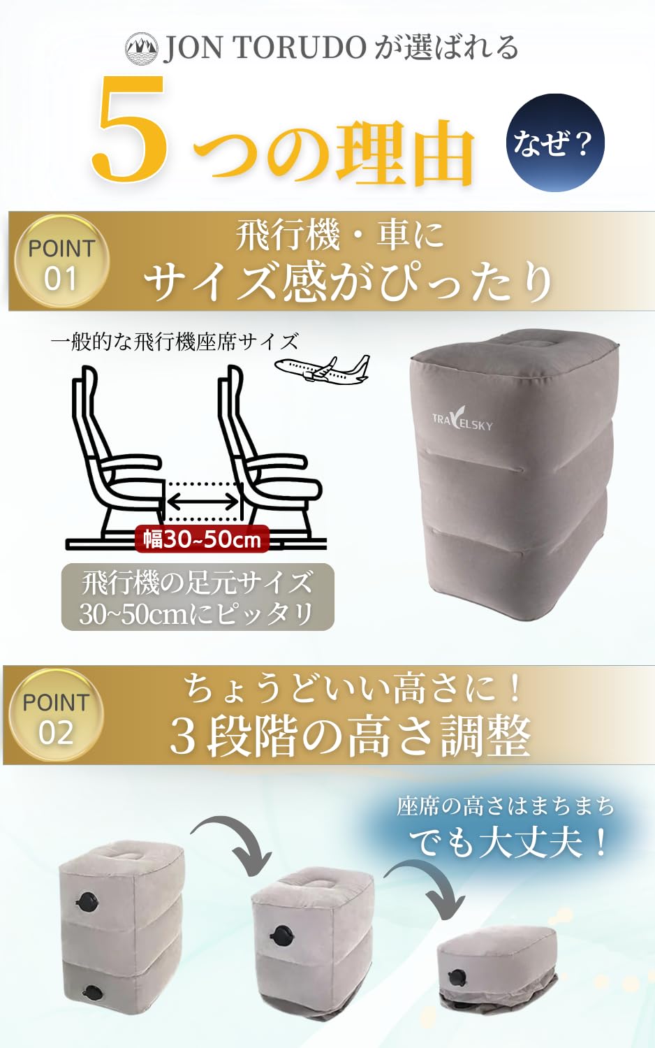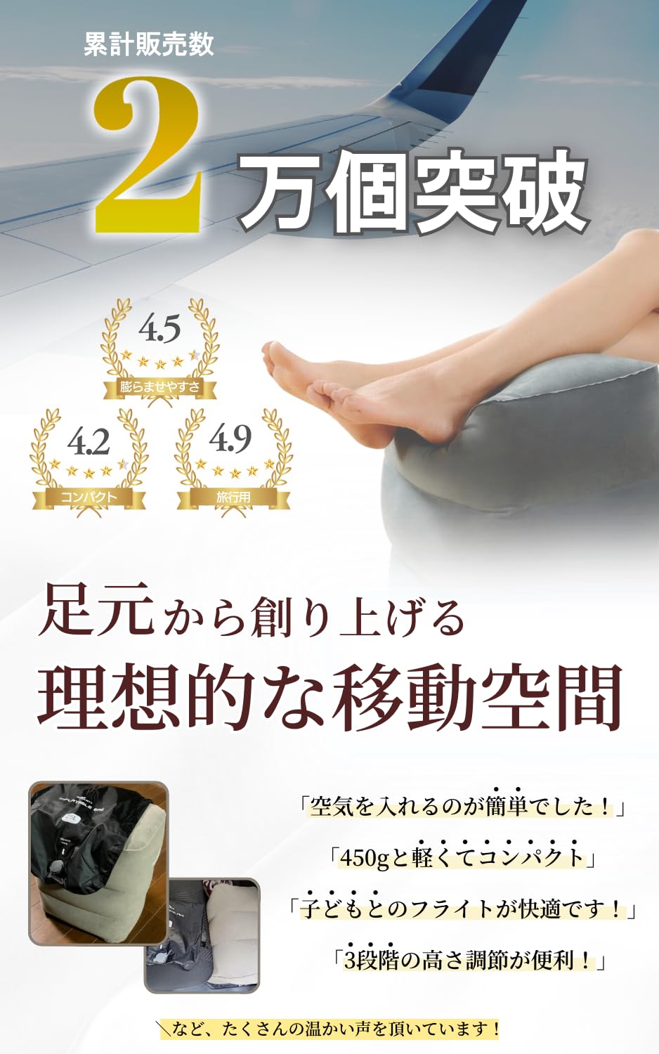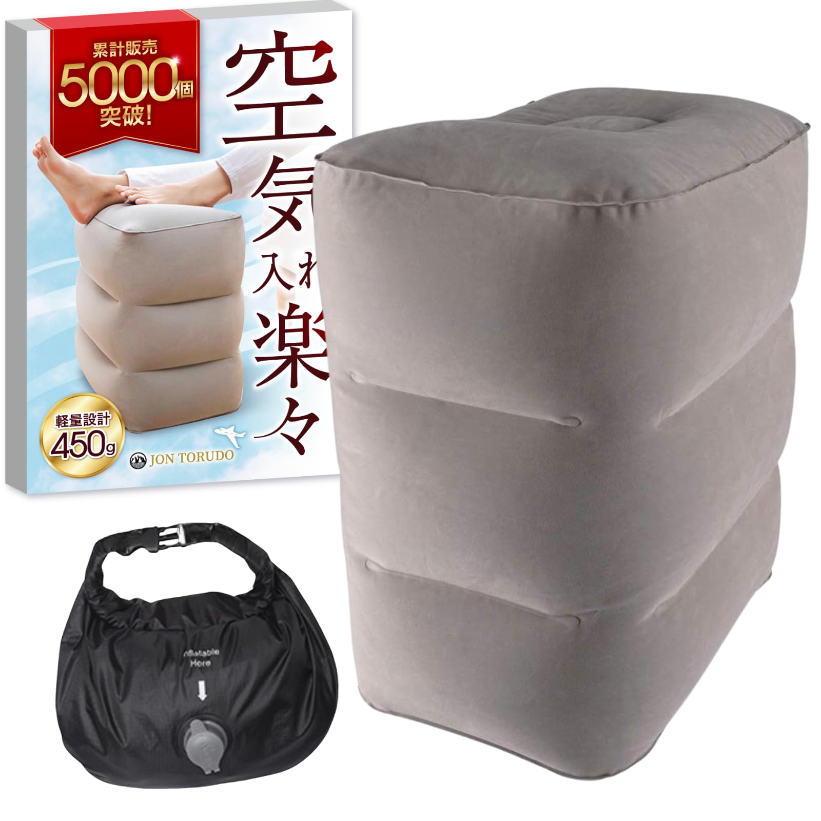 | 【高さ調整可能 フットレスト 車用】1段、2段、3段の高さ調節が可能で、エアー式の設計なので、空気量を調整して様々な場所にフィットさせることができ、硬さも個人の好みに合わせて調節可能です。車やバスや新幹線はもちろん、飛行機の待ち時間に椅子としての利用も便利です。 |