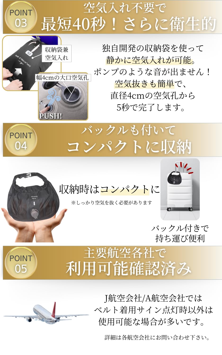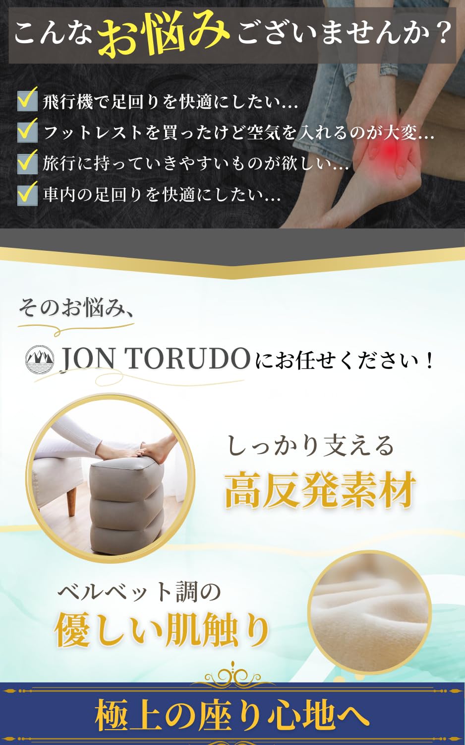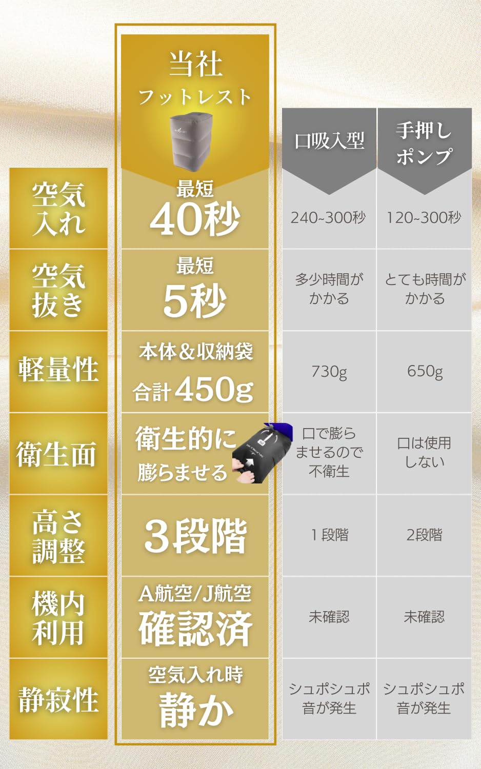 | 【高さ調整可能 フットレスト 車用】1段、2段、3段の高さ調節が可能で、エアー式の設計なので、空気量を調整して様々な場所にフィットさせることができ、硬さも個人の好みに合わせて調節可能です。車やバスや新幹線はもちろん、飛行機の待ち時間に椅子としての利用も便利です。 |