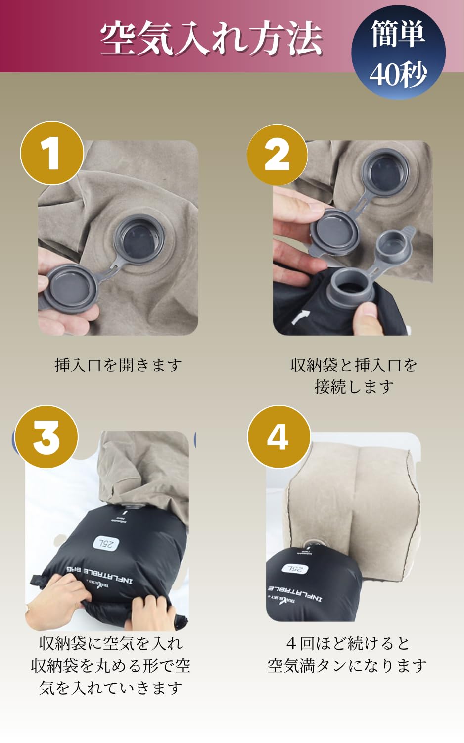 | 【空気入れ楽々&静か】独自開発の収納袋一体型空気入れにより、最短たった40秒で空気を充填することができます。大型の空気孔により、空気を抜くのも瞬時に行えます。さらに、静寂性が高く、周りを気にせず利用できるのが特徴です。 |