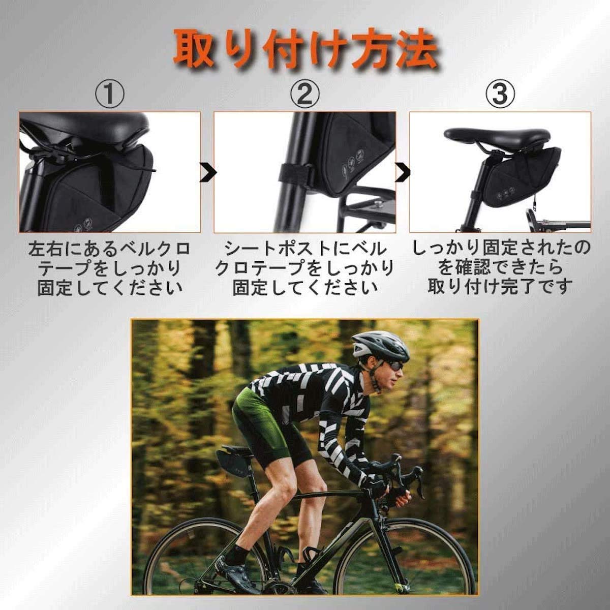 | ?【簡単な装着】バッグ上部の2つのストラップと、バッグ後方のストラップをフレームに固定するだけで装着できます。初心者の方でもお子様でも30秒で簡単装着。強力な面ファスナーを採用しているため、砂利道や舗装されていない道路、山の中などの平坦ではない場所の走行でもバッグの落下を防ぎます。 |