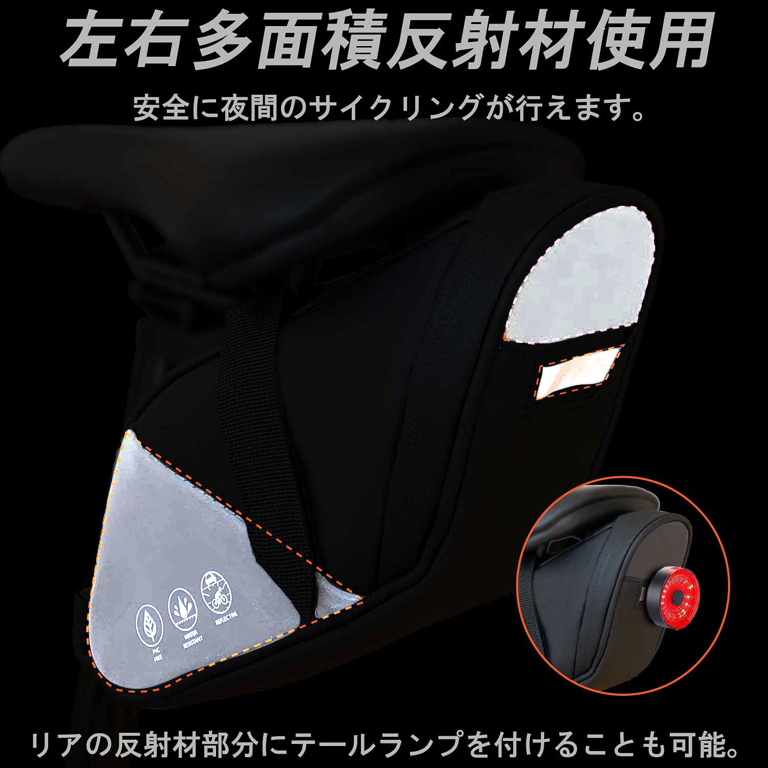 | ?【反射材】バッグ後方の両サイドは広い面積に反射材が加工されており、夜間走行でも安全に走行可能です。並行車や対向車に、いち早くあなたの存在を広く知らせることができます。※画像の丸く赤い反射板は付属しておりません。 |
