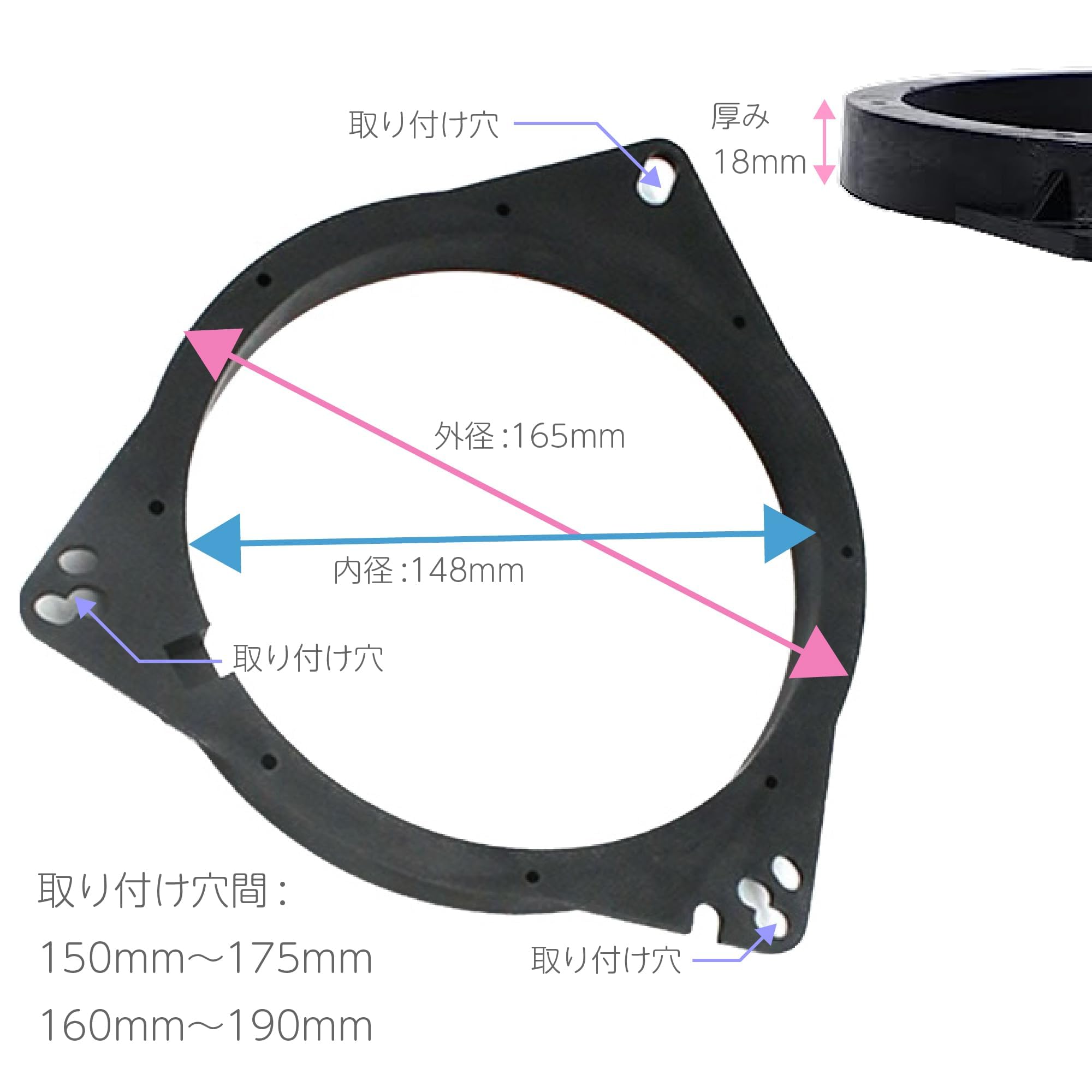 | 【商品仕様】※2個セット 内径:148mm 外径:165mm 厚み:18mm 取り付け穴間:150mm〜175mm,160mm〜190mm 材質:ABS樹脂(強度・耐衝撃性・耐熱性が非常に高い材質です) |