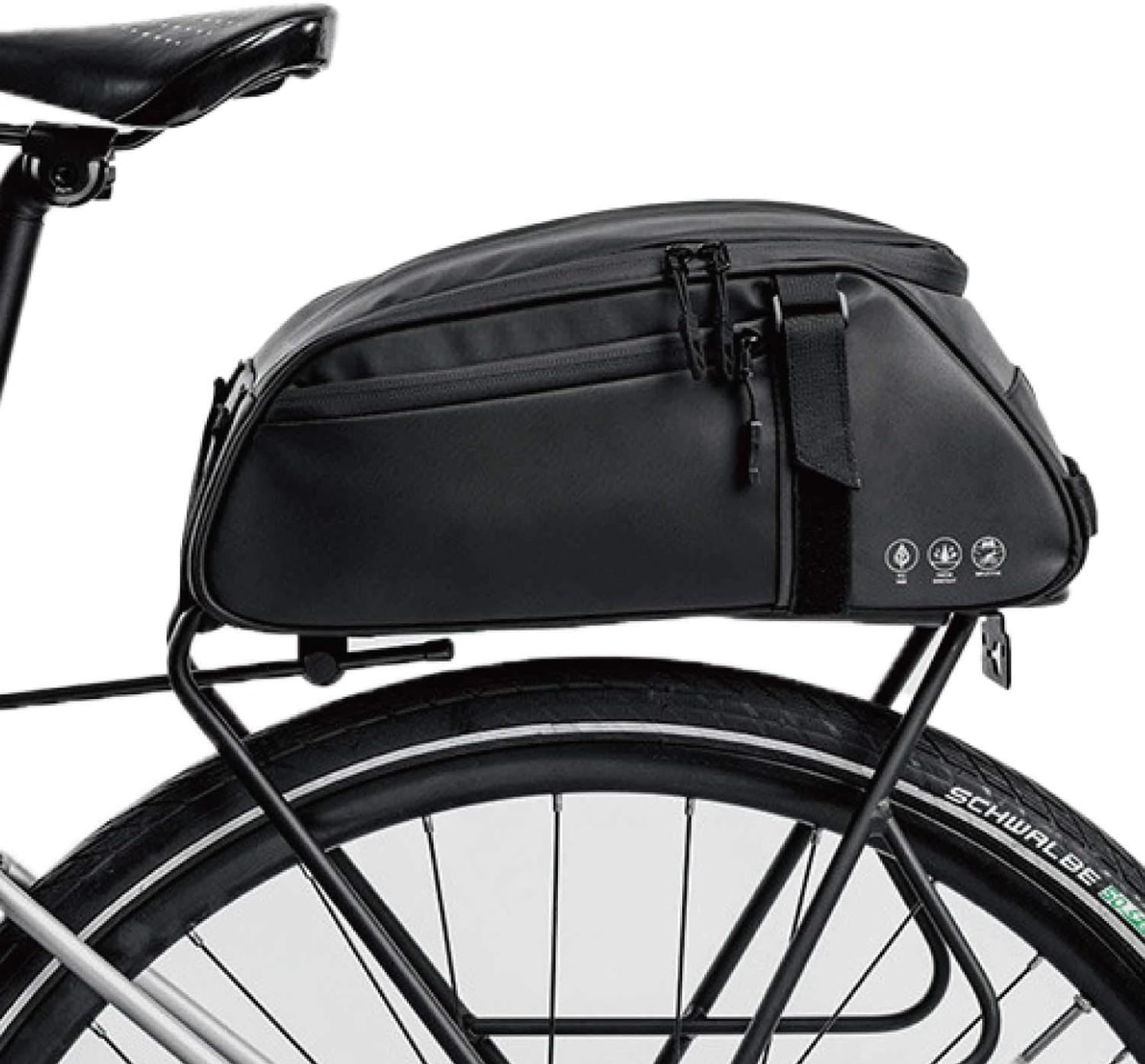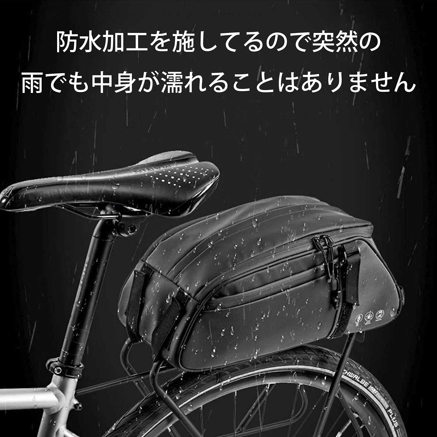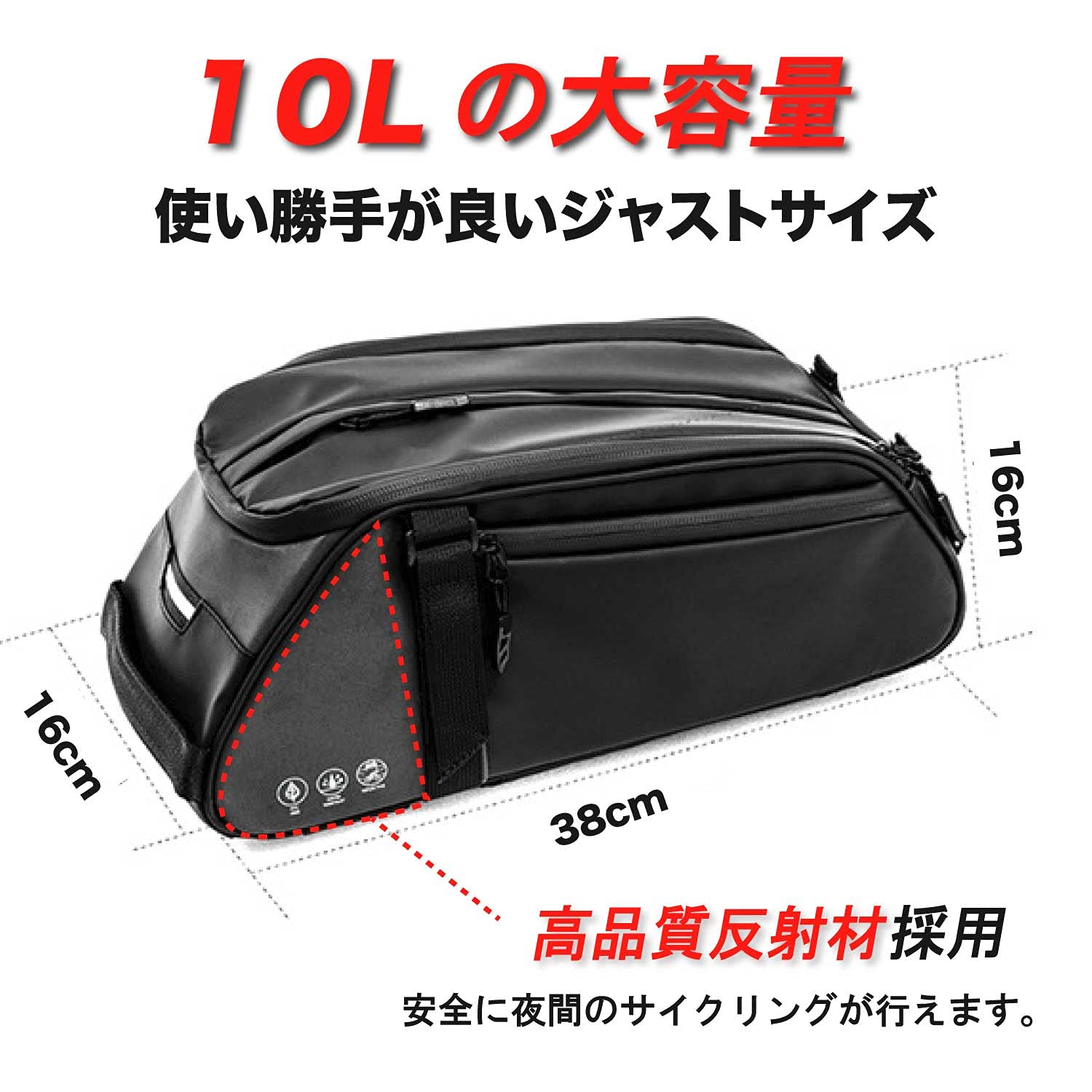 | ?【防水機能】高品質な合成皮革を採用し、防水性バツグンです。突然の雨などにも安心して走行して頂けます。また、止水ファスナーを使用しております。ファスナーを閉めると開口部上下がピッタリくっつき、浸水を防ぎます。 |