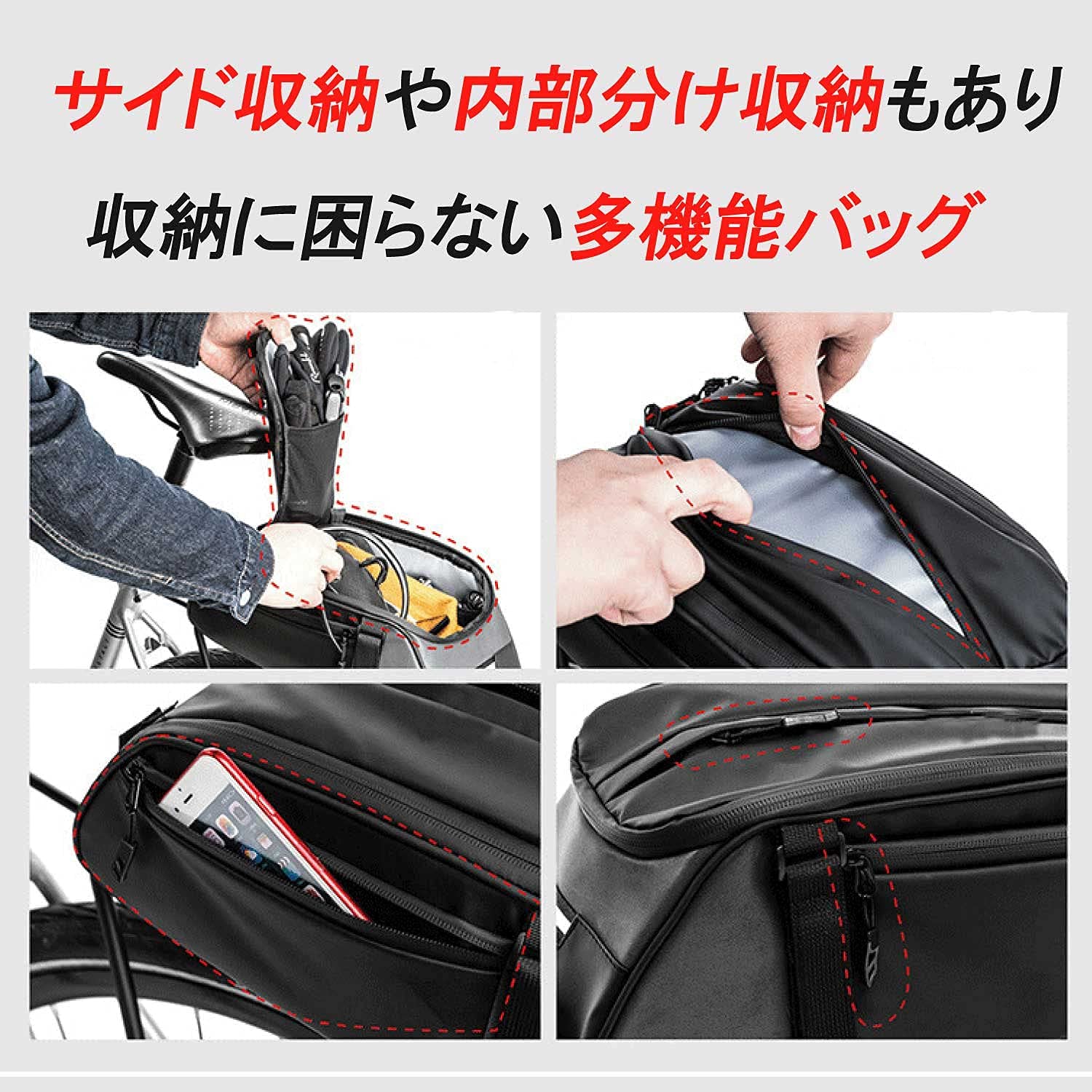 | ?【大容量収納バッグ】少し大きいものを収納したい。スマホや財布、修理キットなどの小物から、日用品やサイクリングアクセサリーなども収納可能。 |