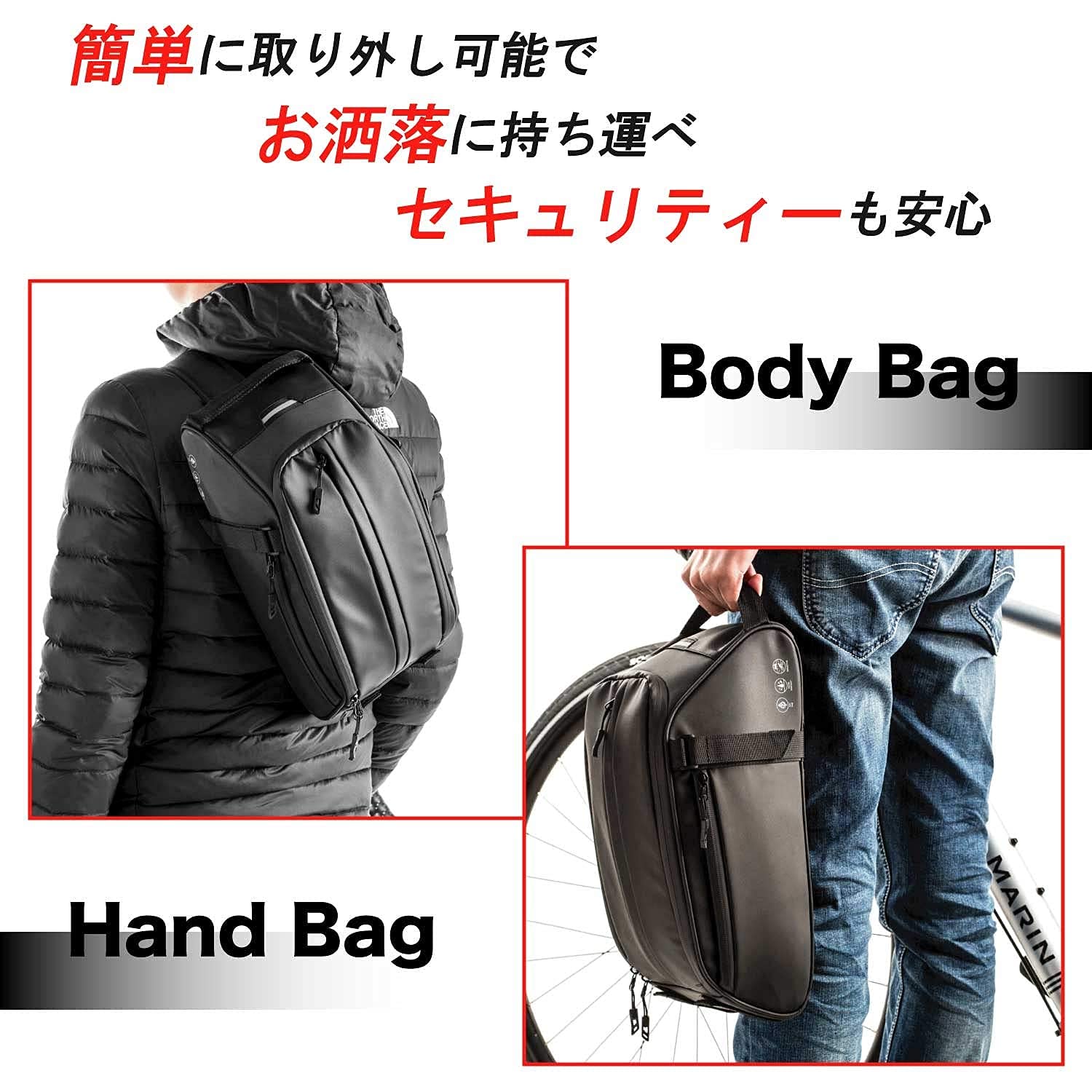 | ?【自転車への着脱】前方と後方に2つずつ、合計4つのストラップがあるため、前後左右の動きにもバッグが流されずに保持することが可能。リアから外すとボディバッグとしても活用ができる2wayタイプ。 |