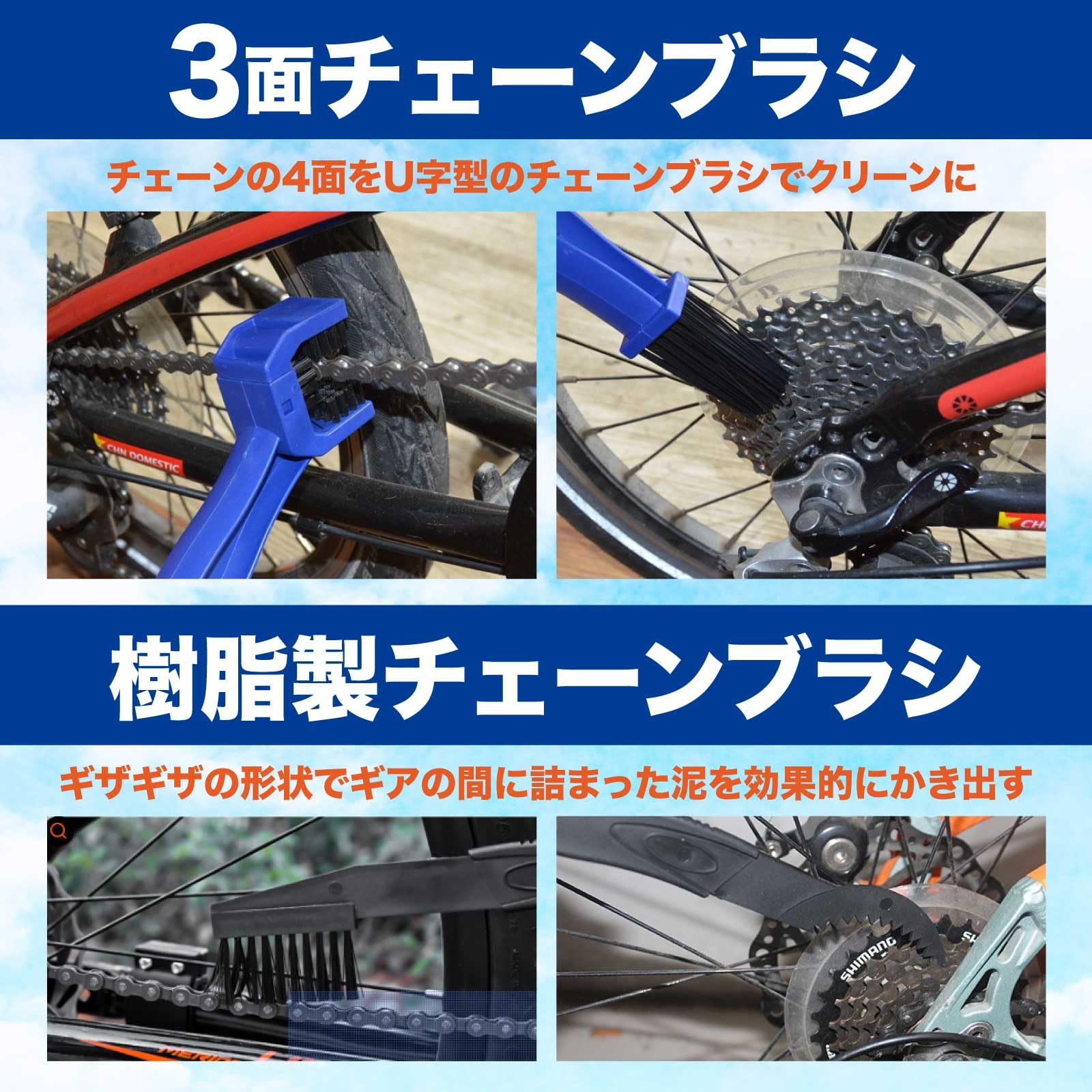 | ?【3面チェーンブラシ】チェーンの4面をU字型の3面チェーンブラシでクリーンにし、反対側のブラシでディレーラー、スプロケット、車輪などのパーツを効率的に掃除します。 |