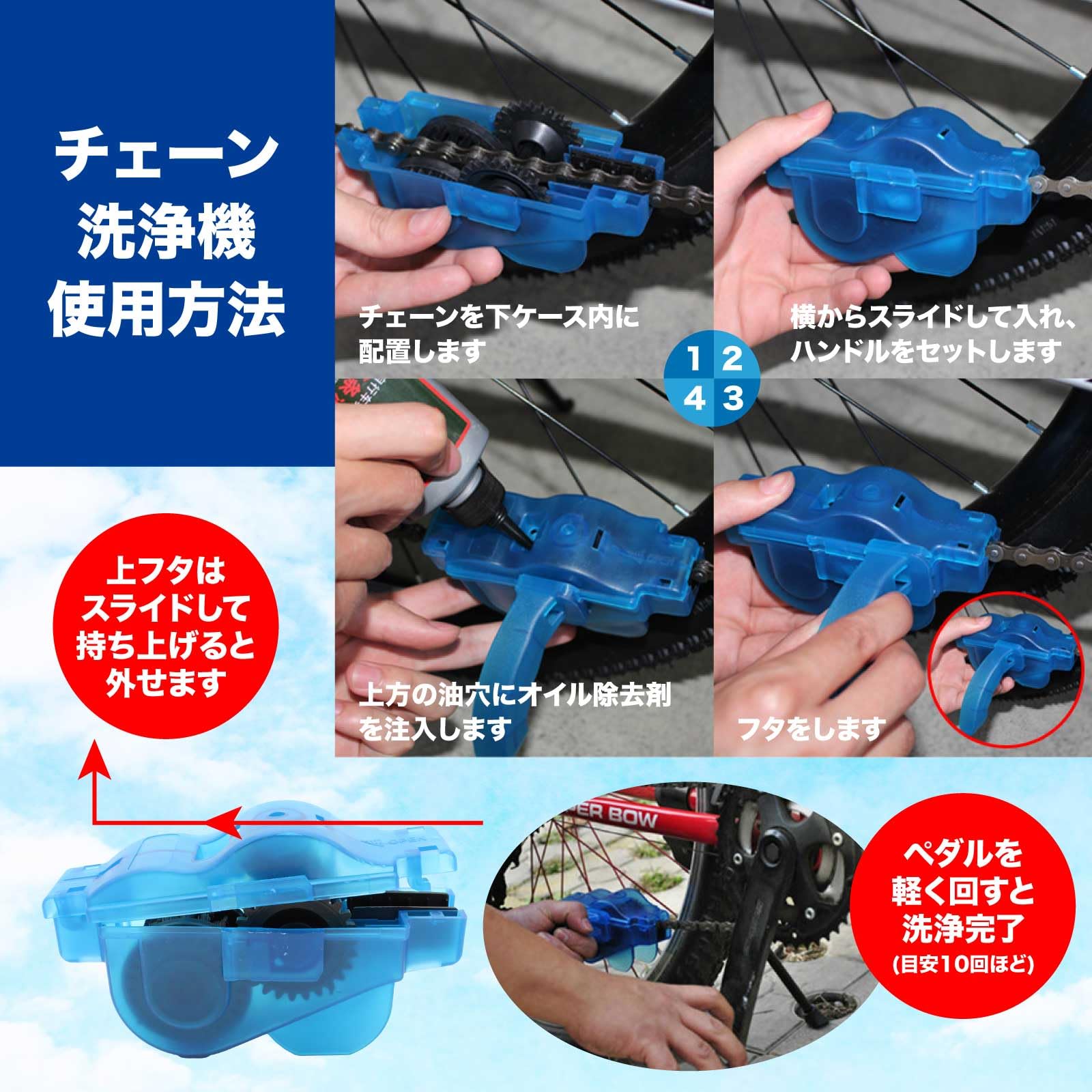 | ?【チェーン洗浄器】自転車のチェーンを手軽に洗浄できるチェーン洗浄器。チェーンを挟んで洗浄剤を注入し、ペダルを回すだけで、簡単に汚れを落とせます。 |