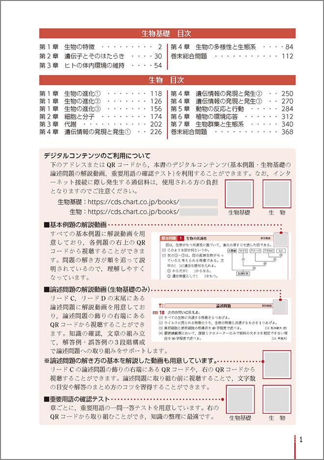 新品未使用品 問題集.別冊解答付属 日常学習から受験までこの1冊でLead! 基礎から入試まで段階を追った丁寧な構成で,基礎事項の習得から大学入学共通テスト,二次試験まで十分に対応できます。 リードA…学習事項の解説で試験前の要点チェック。 リードB…実験のページと基礎CHECKで基礎を押さえられます。 リードC…基本例題+基本問題の構成で,無理なく力を養えます。 リードC+…大学入学共通テストと同じ選択式で思考力を要する問題を精選。 リードD…さらに思考力を養えるよう,少し骨のある問題を精選。 ※リードC,リードDの末尾には論述問題をまとめて収録。 問題に「知識」「思考」マークをつけました! NEW! 「知識・技能」を要する問題には「知識」マークを,「思考力・判断力・表現力」を要する問題には「思考」マークをつけています。観点別評価を行う際に便利です。 詳しいまとめで試験前の総整理も楽々! 各章のまとめ(リードA)は中間・期末テスト前の総整理に役立ちます。 また,問題を解く場合にも参考書の代わりに使えてとても便利です。 これ1冊で高校生物の範囲をすべて習得! 〔生物基礎〕と〔生物〕の両方を収録しているので,「呼吸と光合成」分野や「遺伝情報の発現」分野など,〔生物基礎〕と〔生物〕に分かれている分野も随時先取りして学習できます。 巻末のリードEでは,思考力・判断力・表現力を要する総合問題を扱いました。 見やすい解答,詳しい解説で,さらに学習効率が上がります。 論述問題では採点のポイントを示し,リードEでは本冊の縮刷りを再掲載して問題の読み方を解説しています! 配列・用語は,新課程の数研版教科書と揃っています。 紙面上のQRコードから自学自習に役立つコンテンツを配信! リードCの基本例題の解説動画 リードC・Dの末尾にある論述問題の解説動画(生物基礎のみ) NEW! 重要用語についての一問一答テスト