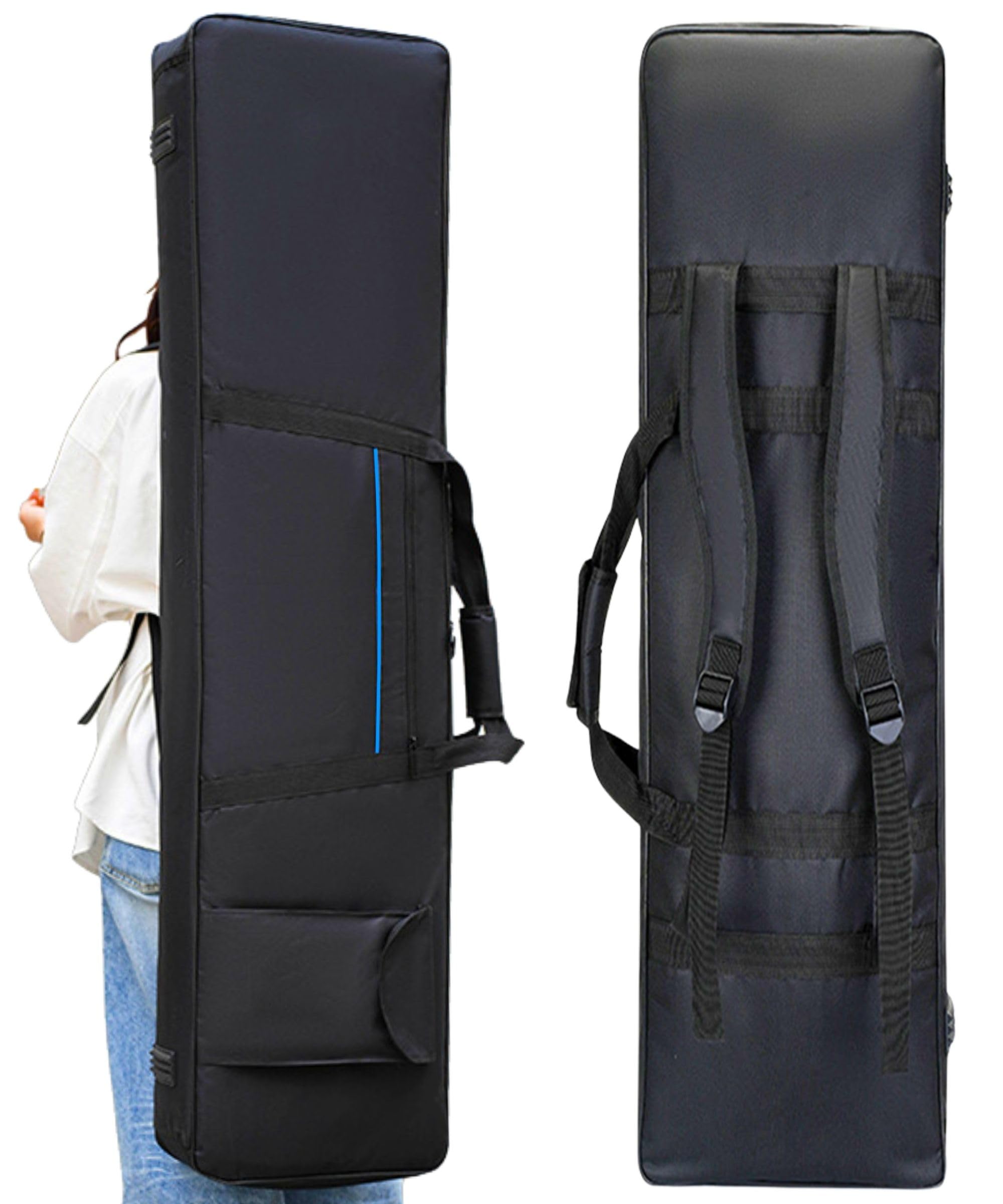 ■対応:61鍵・88鍵盤の電子ピアノ/電子キーボード ■カラー:ブラック×ブルーライン ■素材:防水加工済ナイロン+クッションパッド(厚底仕様) ■仕様:調整可能なリュック式ショルダーベルト付き・手持ちの2WAY、ポケット×2 ■外寸目安:61鍵盤:約94×33×12cm/88鍵盤:約136×33×17cm ■用途:キーボード収納、ピアノカバー、楽器ケース |