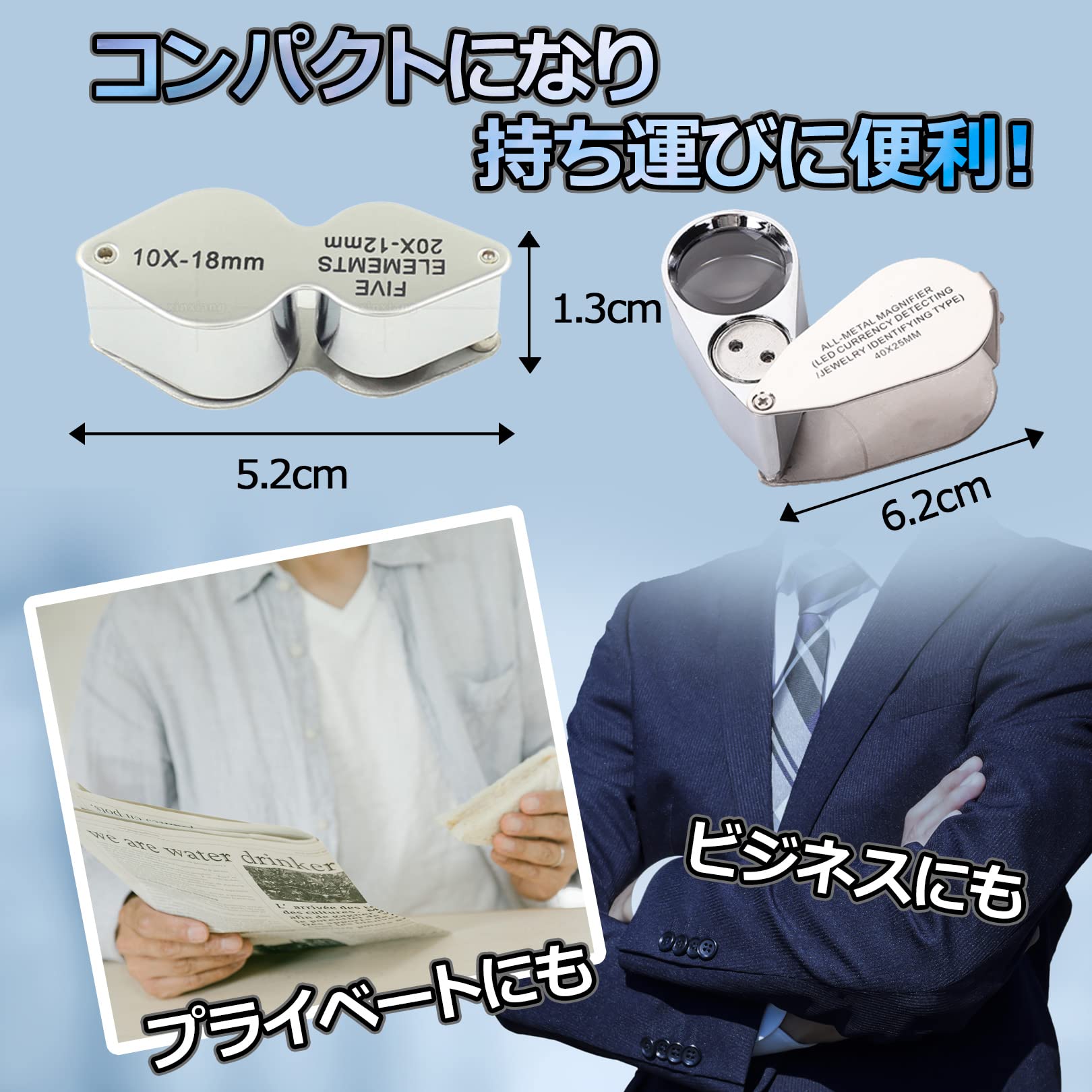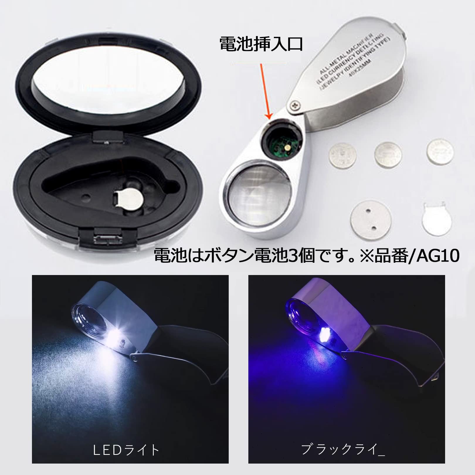 高倍率40倍のLED、UVライト内蔵のルーペは、宝石、アクセサリー表面の細かいキズ、鑑定、印刷物のドットのズレ、アンティークグッズ、アート鑑賞などに適しています。ステンレス製、ボタン電池、保護ケース付属。 |