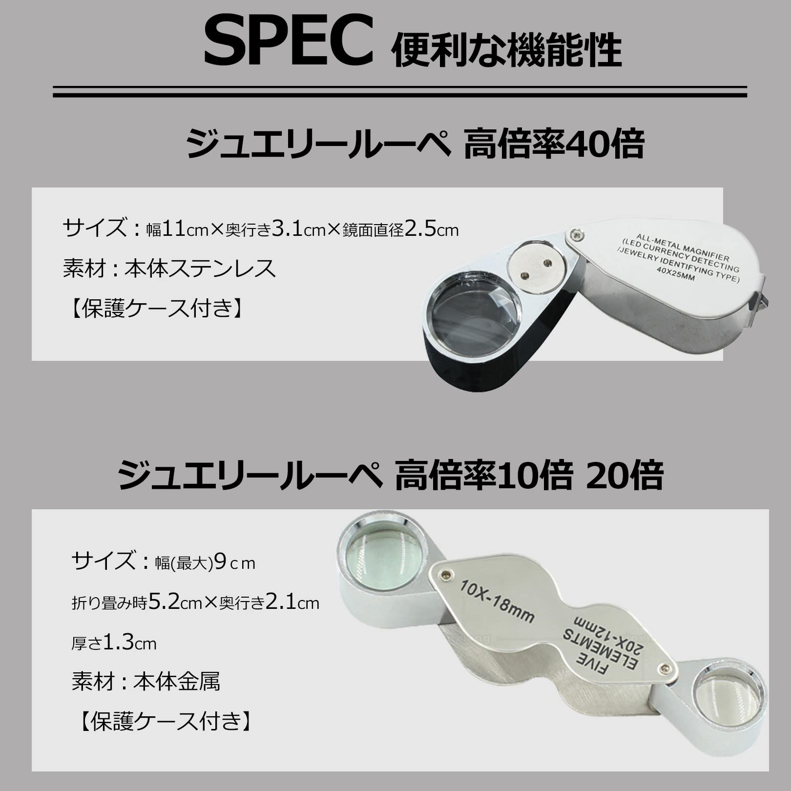 【倍率10倍/20倍】 サイズ:幅(最大)9(折り畳み時)5.2×奥行き2.1×厚さ1.3cm、サイズ:金属、保護ケース付き、使用電池:LR1130/3個【倍率40倍】 サイズ:幅11×奥行き(最大)3.1×鏡面直径2.5cm、素材:ステンレス、LEDライト、折り畳み式、保護ケース、ボタン電池付き※モニターの環境により、色の見え方に若干差が生じる場合がございます。 |