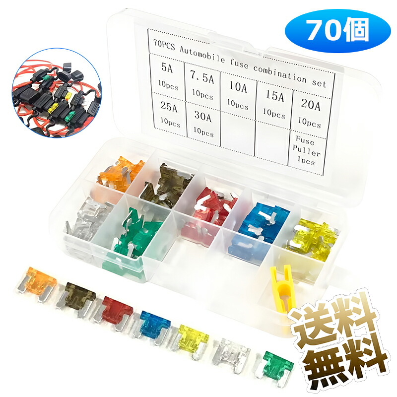 【セット内容】5A、7.5A、10A、15A、20A、25A、30Aのヒューズ各10個、計70個。ヒューズ脱着工具1個、収納ボックス1個が付属しています。
