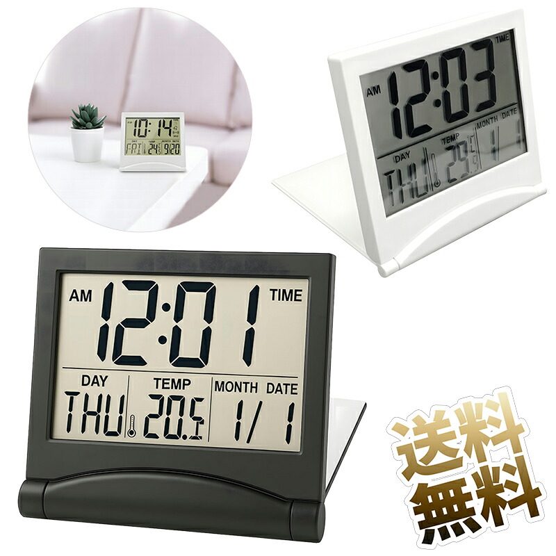 目覚まし時計 置き時計 大画面スリムクロック 折りたたみ式 薄型 小型 アラーム カレンダー 温度表示 ブラック ホワイト