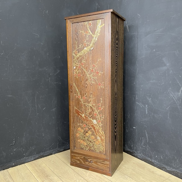 三味線 箪笥 2棹がけ 収納棚 梅 蒔絵? 小物引出し付き 【中古】 約41x30x124cm 和楽器 ケース/510315