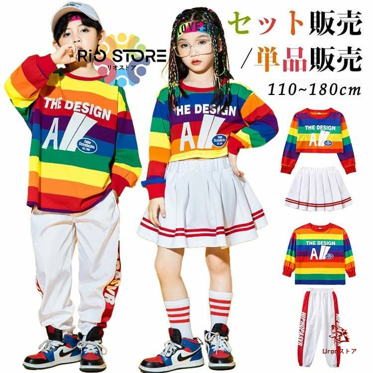 キッズダンス 衣装 レインボー ボーダー柄 セットアップ 女の子 男の子 カジュアル 発表会 カラフル 子供服 練習着 ガールズ ヒップホップ ロングズボン スカー