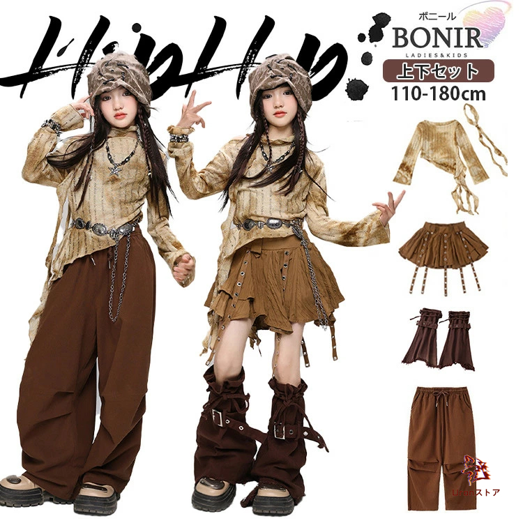 ブラウン系 キッズダンス hiphop ダンス衣装 女の子 茶色系 タイダイ イエロー 長袖 ブラウン スカート カーゴパンツ ズボン ルーズソックス ガールズ ジャッ