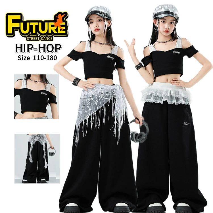 ダンス衣装 キッズ アイドル風 へそ出し トップス 女の子 セットアップ 肩出しトップス カーゴパンツ 腰巻き かっこいい 韓国 k-pop衣装 ヒップホップ ワイドパ