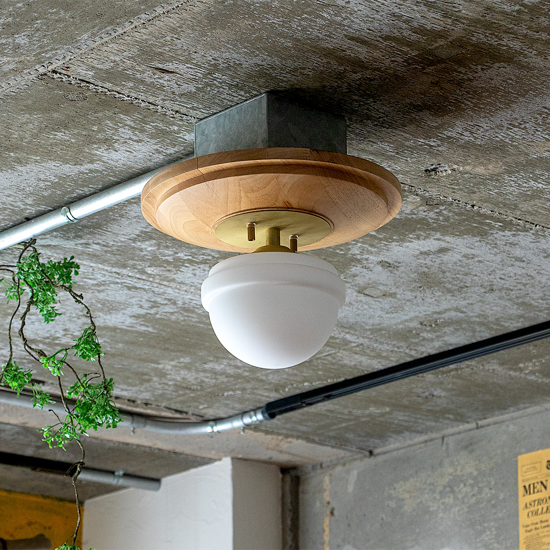 シンプルな装飾を施したウッドプレートとクラシカルなガラスシェードを組み合わせたシーリングライト。