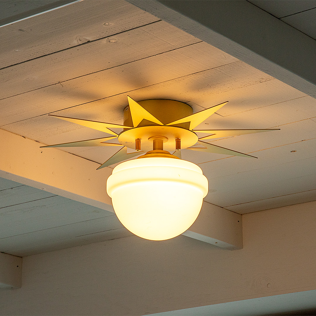 太陽の光芒を思わせる真鍮製フレームが印象的な、ミッドセンチュリーモダンを体現したシーリングライト。