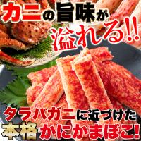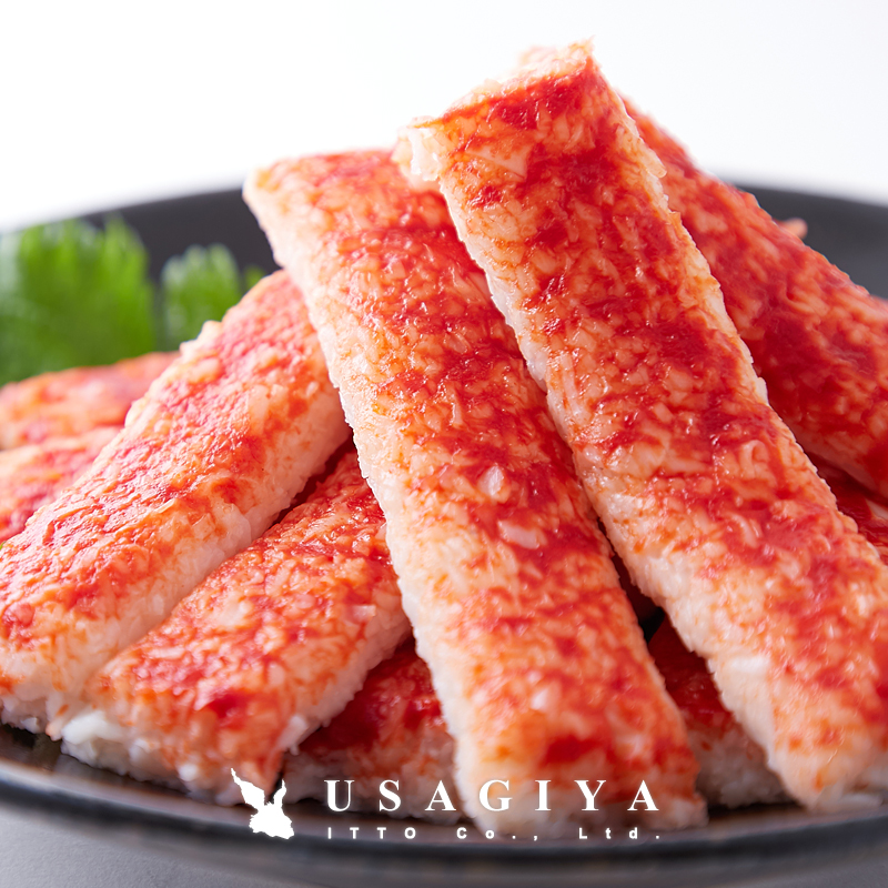 魚肉すり身(アメリカ製造)、食塩、発酵調味料、卵白、カニエキス/加工デンプン、調味料(アミノ酸等)、トレハロース、ベニコウジ色素、香料、パプリカ色素、(一部にえび・かに・小麦・卵・大豆・豚肉を含む)