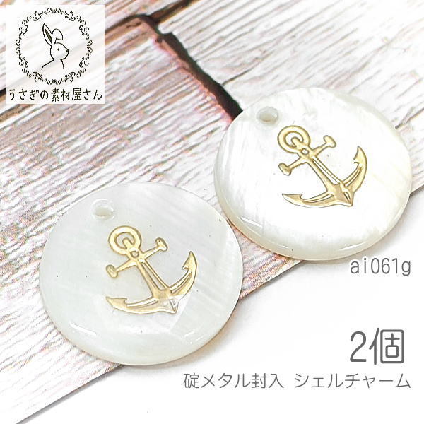 シェルチャーム 16mm アンカー 碇 淡水シェル ペンダント メタル封入 横穴ビーズ マリン 夏 2個/ゴールド色