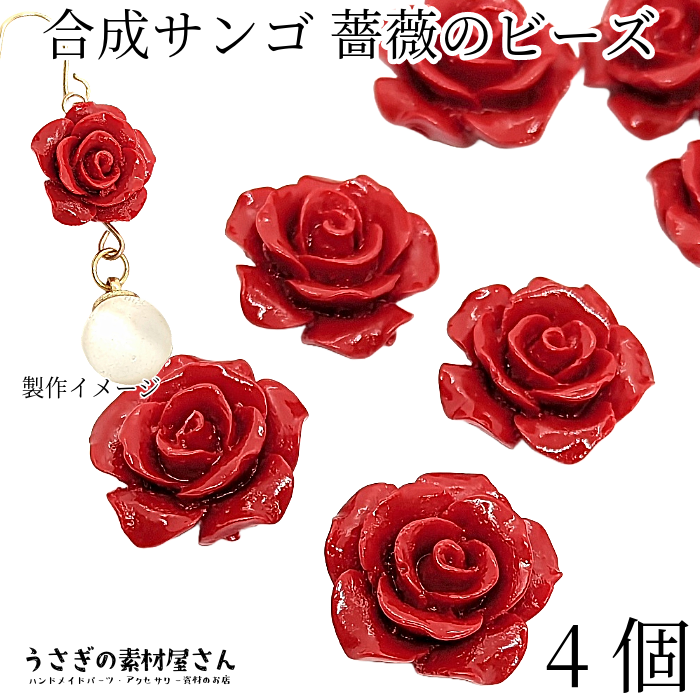 フラワービーズ 合成 珊瑚 薔薇 ローズ ビーズ 14mm〜15mm前後 4個 花 レッド 赤系 通し穴 サンゴ 大人 アクセサリーパーツ うさぎの素材屋さん 海の生き物
